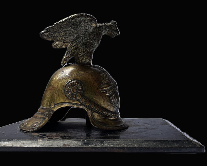 While your instinct to place this in the Garde du Corps lane is directionally reasonable from a collector’s point of view, it is important to state attribution carefully: there are no visible maker marks, regiment stamps, or engraved identifiers present in the images, and the design language here is “evocative of” Prussian Guard/Cuirassier styling rather than a one-for-one reduction of a specific marked helmet. That said, the piece is absolutely consistent with the kind of romanticized, instantly recognizable Prussian heavy cavalry helmet profile that would be chosen for a commemorative object, veterans’ desk ornament, paperweight, or mantle display. In other words: the concept is correct—this is a miniature cuirassier/guard helmet, and “lobster tail” is a fair descriptive term for the overall helmet type being referenced—just avoid claiming it is definitively a regiment-specific Garde du Corps artifact unless the underside or hidden surfaces reveal marks not shown here.