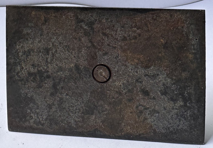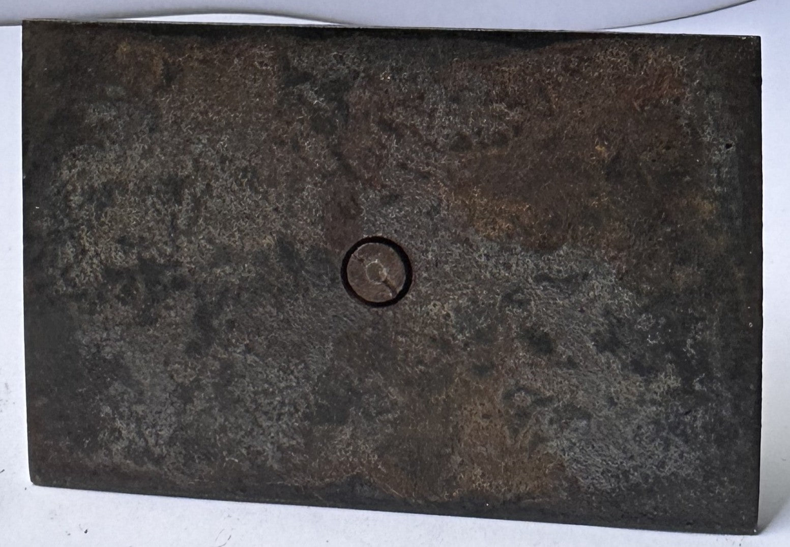 The base is a heavy, rectangular plate with beveled edges, finished in a darkened, timeworn surface. The underside shows a central fastener point (a rivet or peened post) securing the helmet assembly to the base. The base presents as steel or iron with stable oxidation and surface wear, consistent with age and long-term handling. This construction method is practical and period-plausible for a desk piece: the weight keeps it planted, the single central attachment keeps the silhouette clean, and the overall presentation is meant to be viewed from multiple angles.