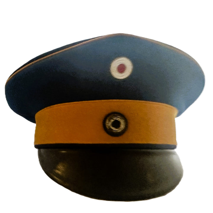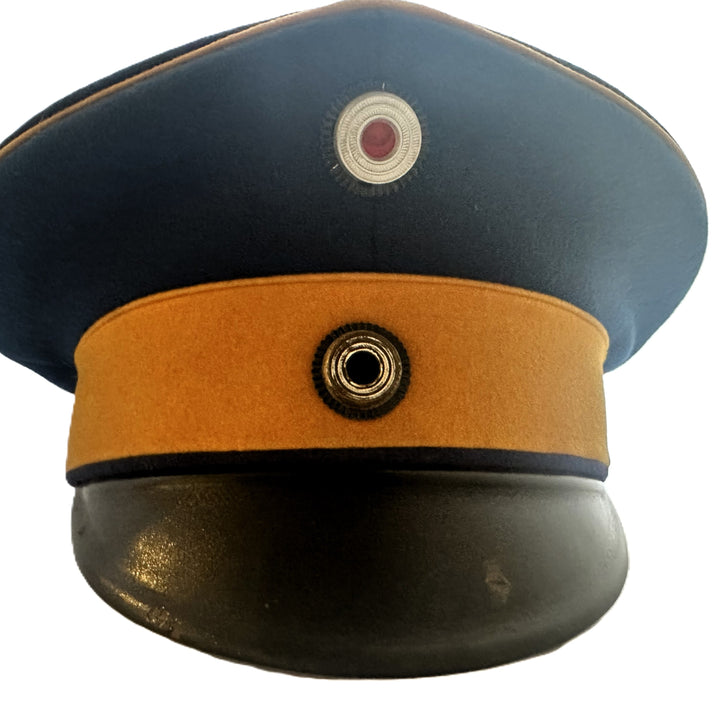 This is an excellent example of a Prussian Dragoon Regiment Officer's cap (Schirmütze) from the pre-World War I period. The dragoon regiments in the Imperial German army were part of the light cavalry, often used for reconnaissance and swift mobility on the battlefield. The royal blue crown and yellow band identify this as belonging to one of the Dragoon Regiments, most likely one from Prussia, where this color combination was prevalent.