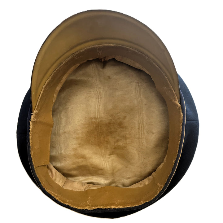 - Interior: The cap’s liner shows some aging and wear, consistent with its age. The silk liner is somewhat stained, and the leather sweatband shows use but remains intact.