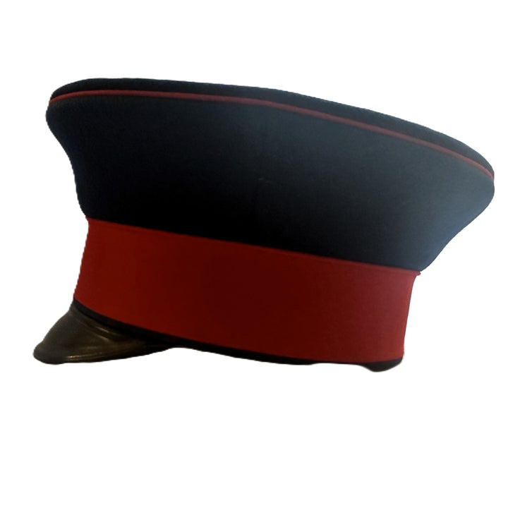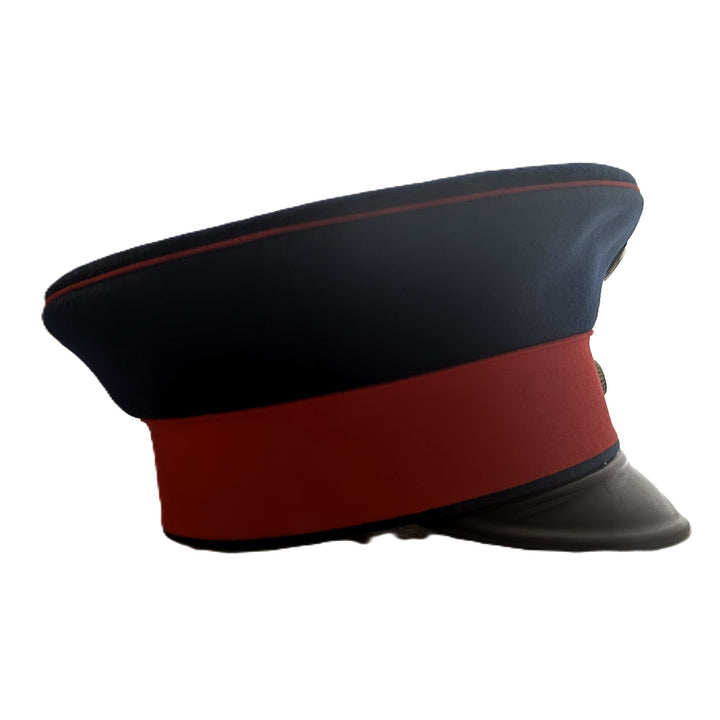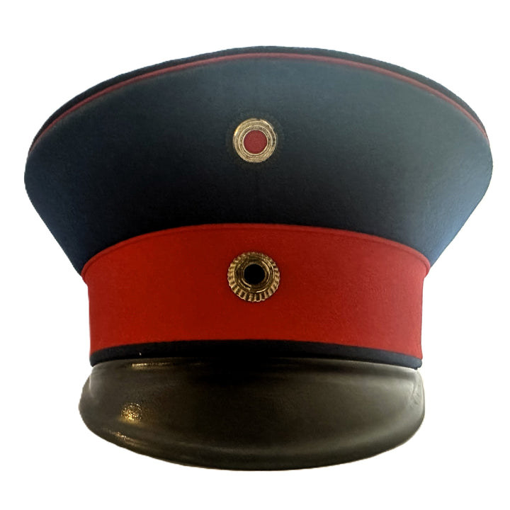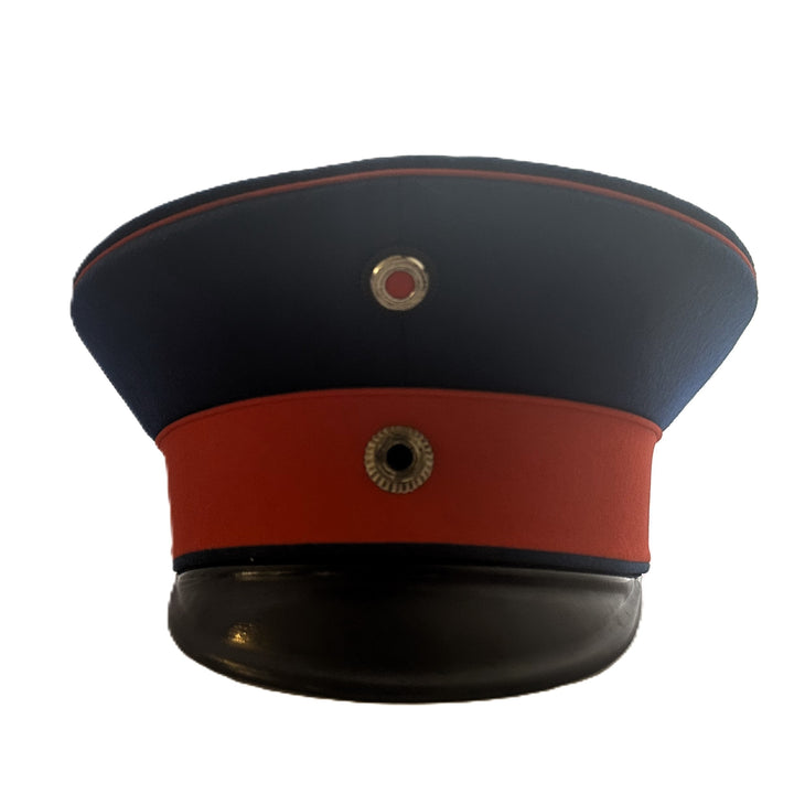- The cap features a blue wool crown with a red wool band, which was standard for infantry officers. The cap has a black lacquered leather visor, which is in excellent condition with minimal wear. The overall structure of the cap has held up remarkably well over the years, showing only minor signs of age-related wear.