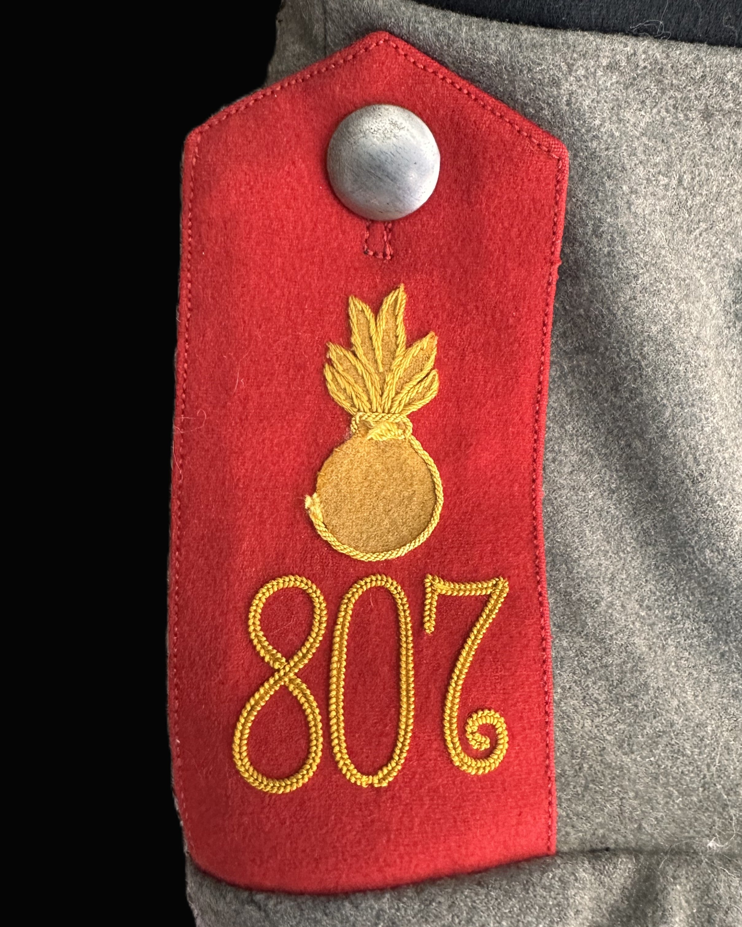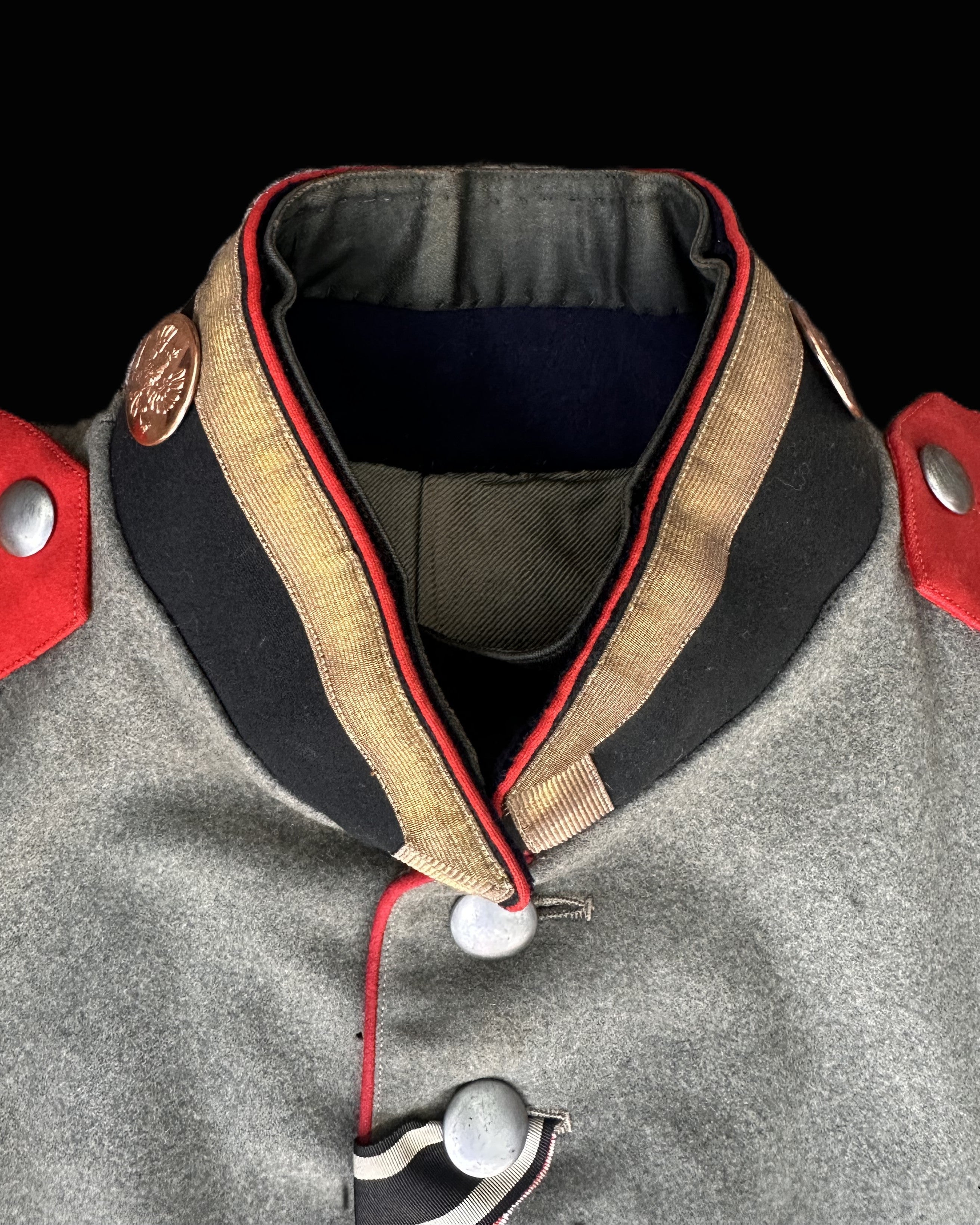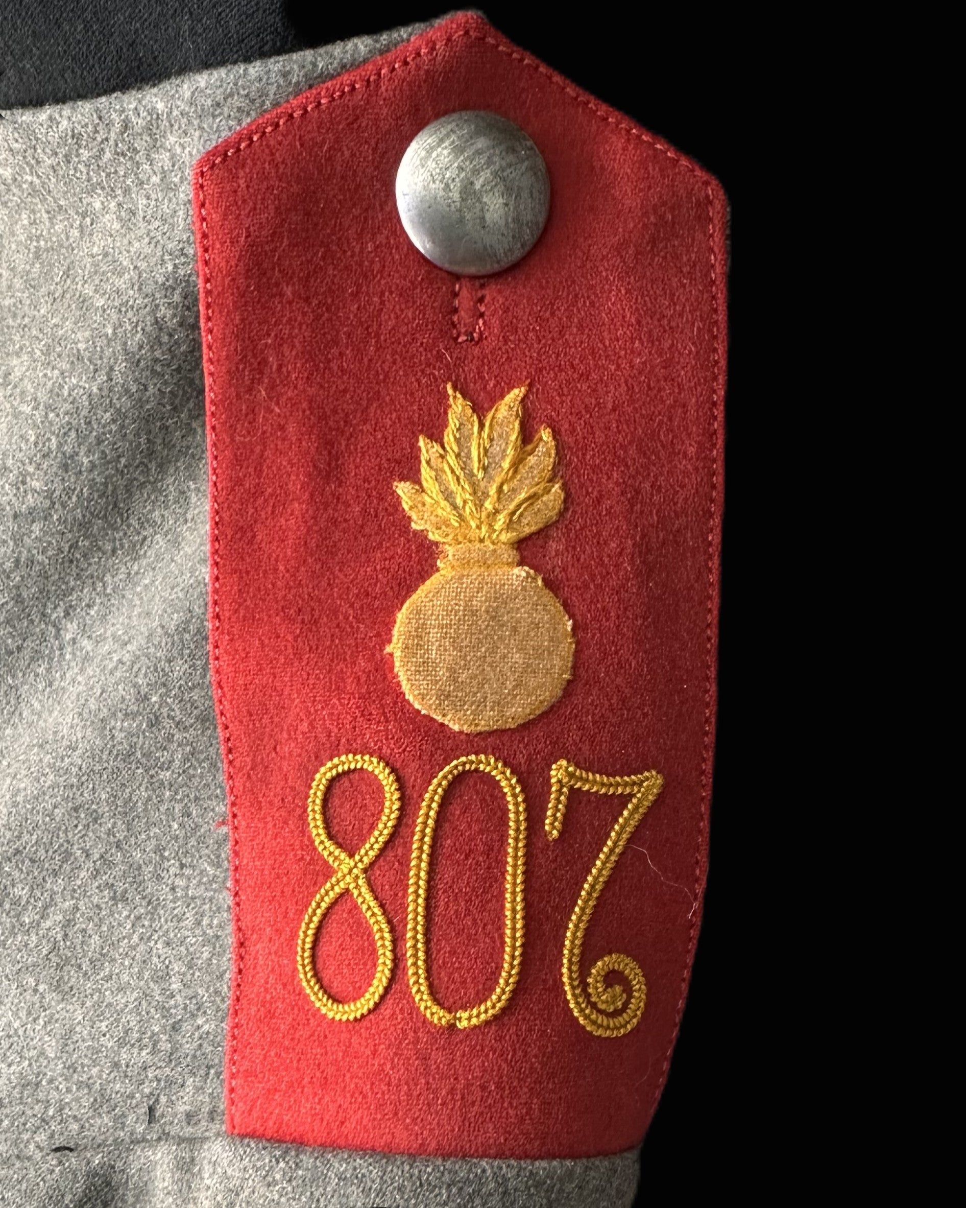 The Feldrock is constructed from field-grey wool, featuring a stand-and-fall collar with black and gold Litzen, denoting Prussian origin and NCO (Non-Commissioned Officer) status. The red piping along the front closure, collar, cuffs, and rear skirt highlights the tunic’s infantry designation. Both shoulder boards are made of red wool with yellow embroidered regimental number “807” and the flaming grenade device, confirming assignment to Infantry Regiment 807—a unit raised during wartime expansion. The tunic is adorned with silvered pebbled buttons, all of which appear original and correctly matched. The cuffs and rear skirt are finished with additional Prussian NCO tresse, and the left breast retains a period Iron Cross 2nd Class ribbon, a classic field-worn detail.