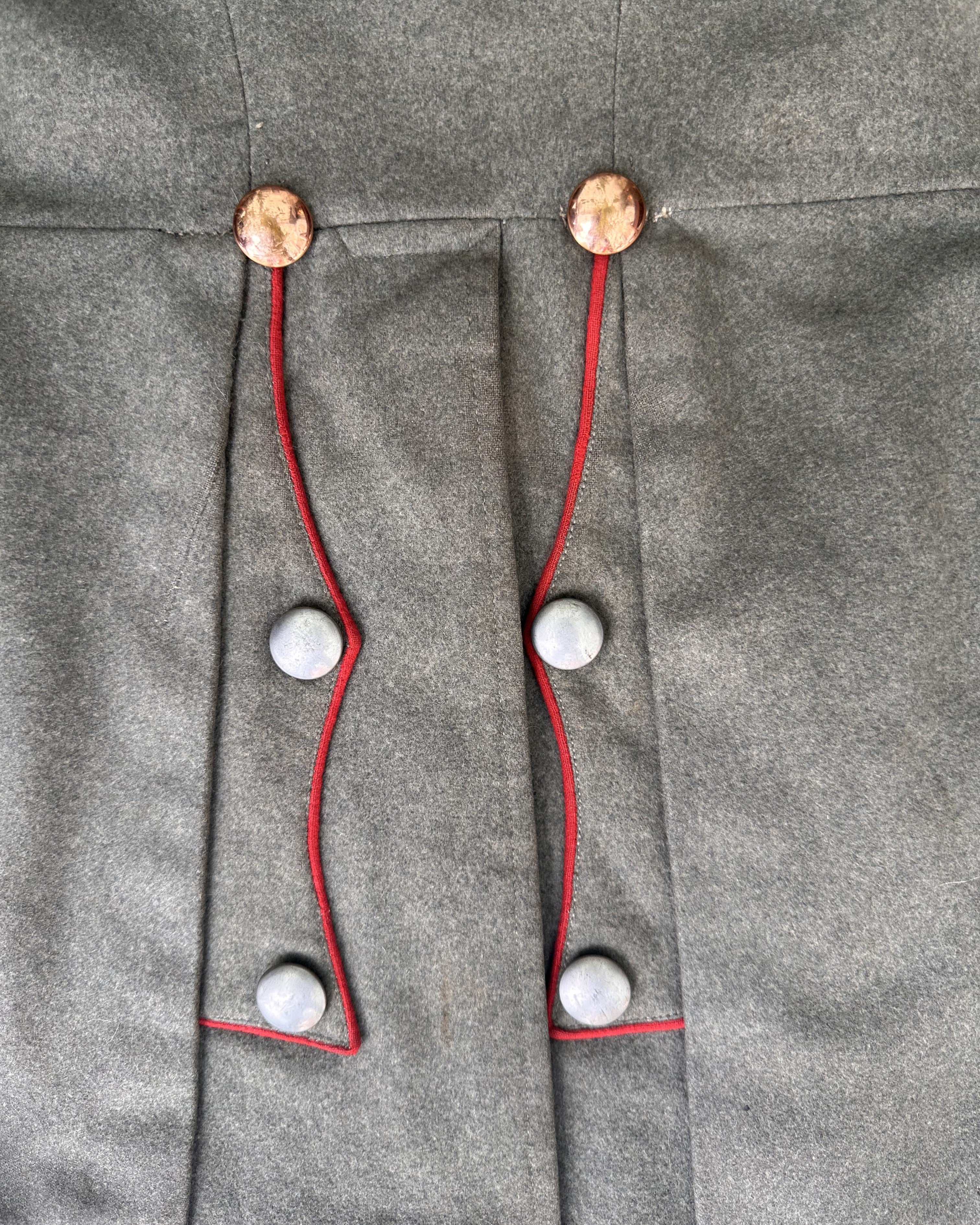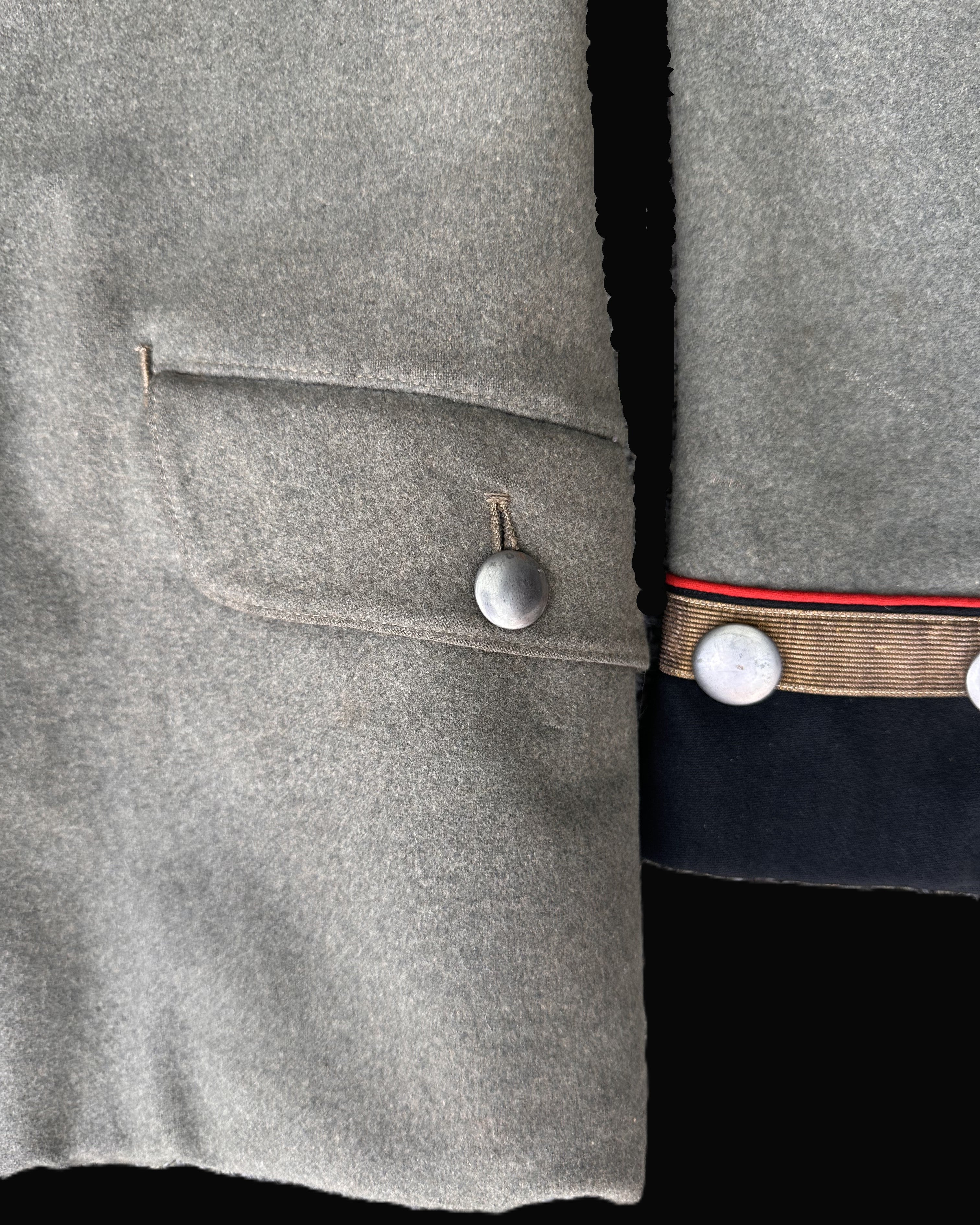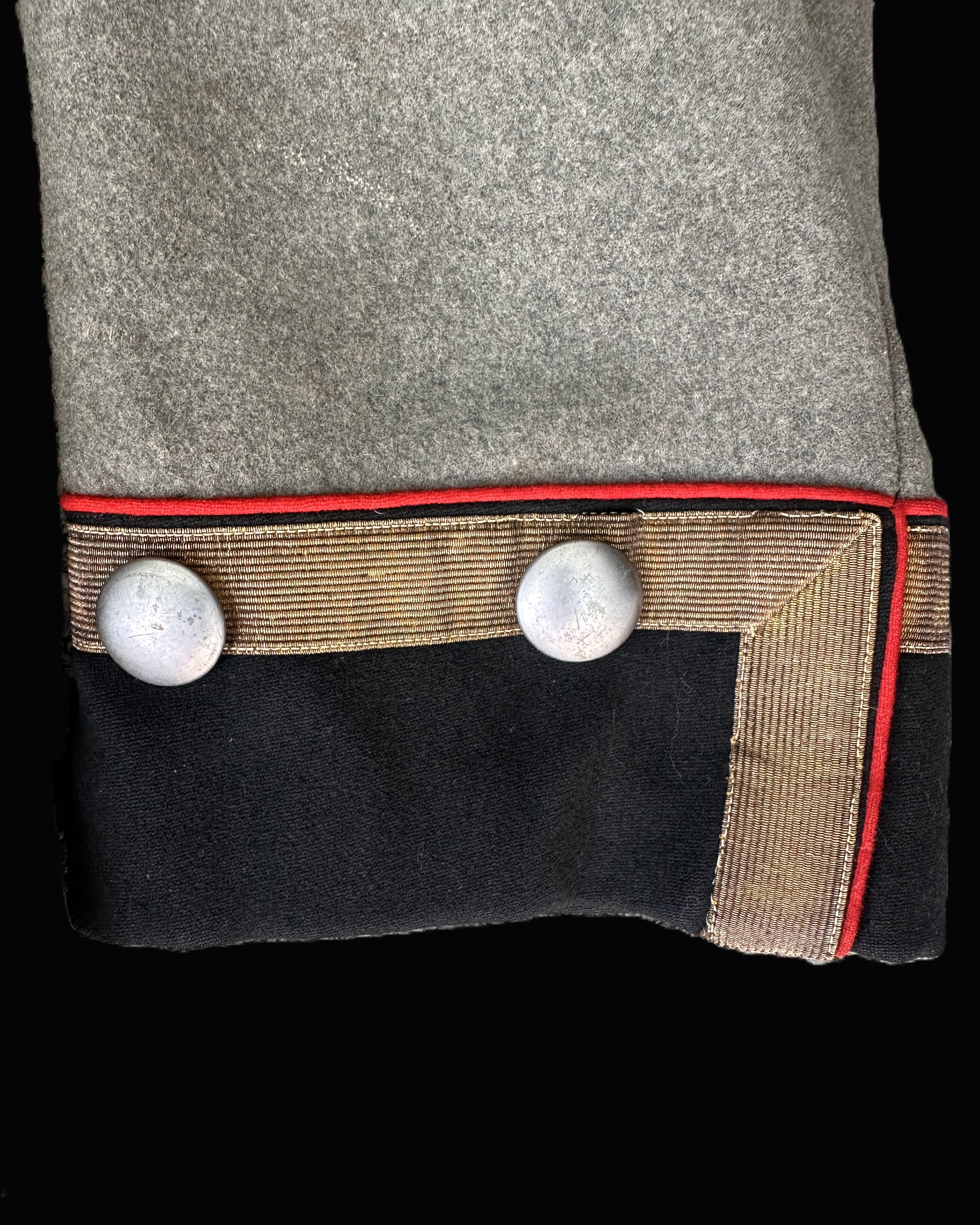 The Feldrock is constructed from field-grey wool, featuring a stand-and-fall collar with black and gold Litzen, denoting Prussian origin and NCO (Non-Commissioned Officer) status. The red piping along the front closure, collar, cuffs, and rear skirt highlights the tunic’s infantry designation. Both shoulder boards are made of red wool with yellow embroidered regimental number “807” and the flaming grenade device, confirming assignment to Infantry Regiment 807—a unit raised during wartime expansion. The tunic is adorned with silvered pebbled buttons, all of which appear original and correctly matched. The cuffs and rear skirt are finished with additional Prussian NCO tresse, and the left breast retains a period Iron Cross 2nd Class ribbon, a classic field-worn detail.