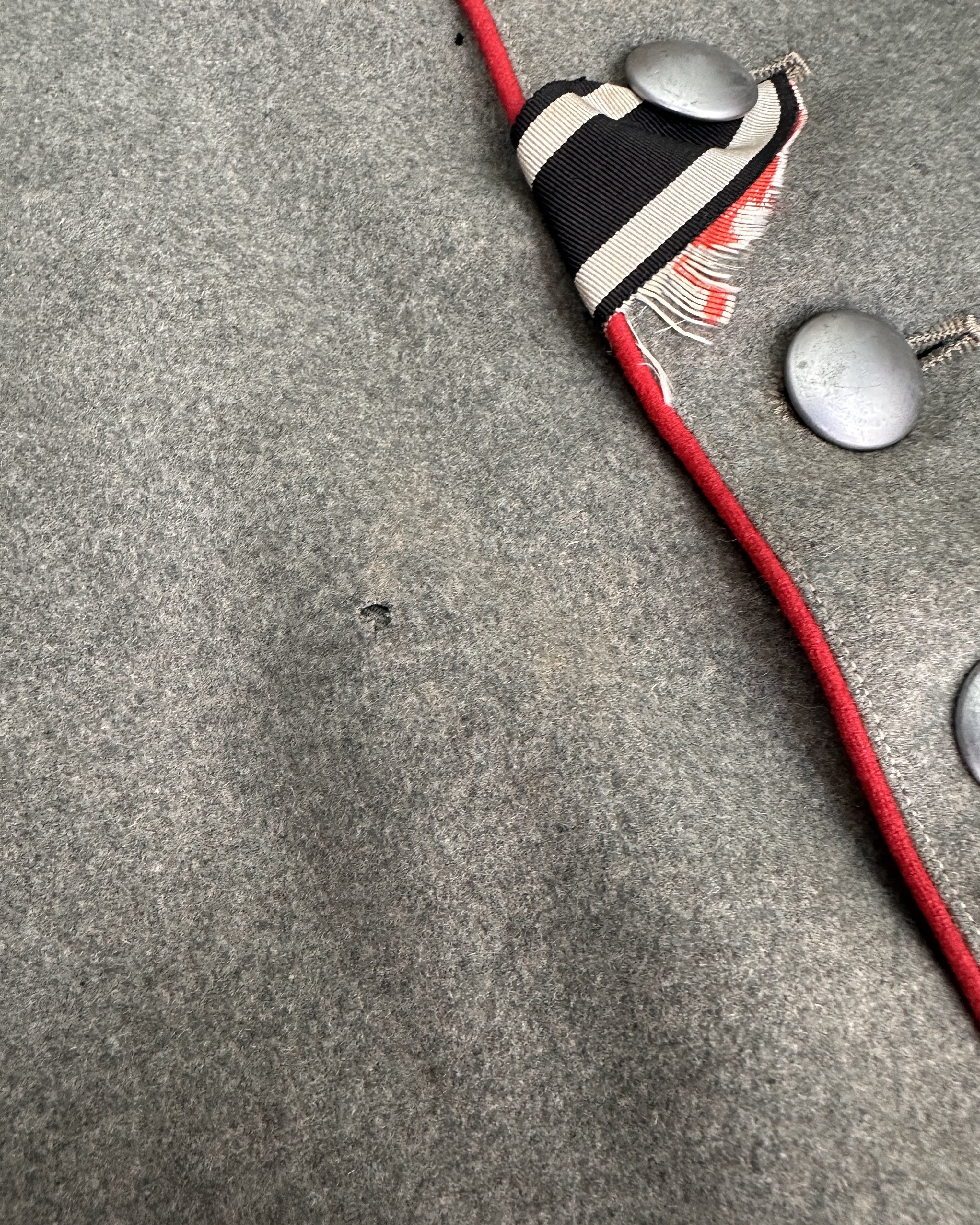 The tunic remains in very good condition for its age, with strong color retention and minimal mothing. There are a few small moth holes visible on the front and rear panels (see detailed photos), but these do not detract from the overall presentation. The insignia, buttons, and tresse are all intact and original to the piece. The Iron Cross ribbon shows honest period wear. No major repairs or alterations are evident, and the tunic retains its original lining.