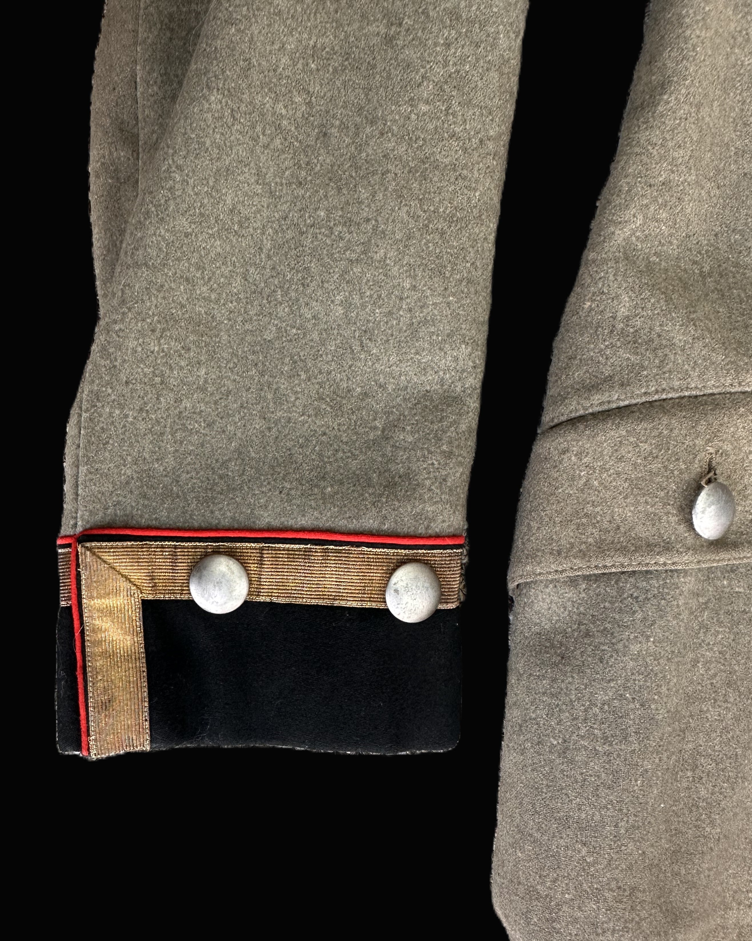 Infantry Regiment 807 was formed in 1914 as part of the massive mobilization for the Great War, drawing men from the Prussian provinces. The Model 1910 Feldrock was the standard service tunic for the Imperial German Army, and this example reflects the regulations for NCOs, including the metallic tresse and regimental insignia. Such tunics were worn on campaign and in garrison, and surviving examples with clear regimental identification are increasingly scarce.