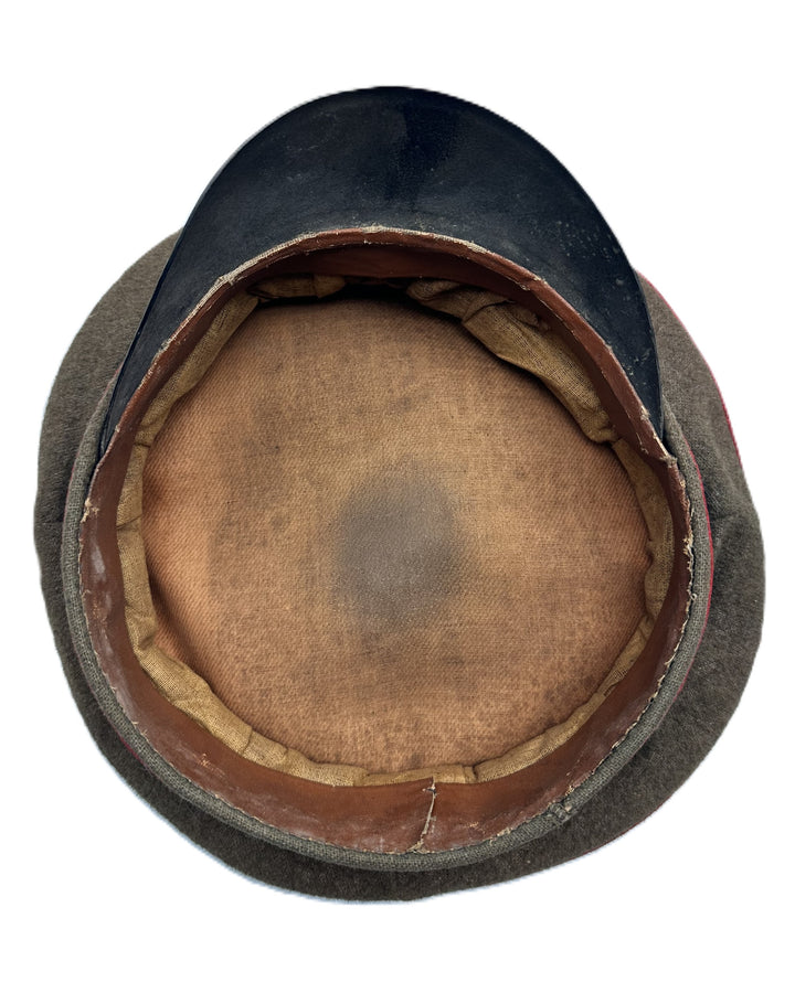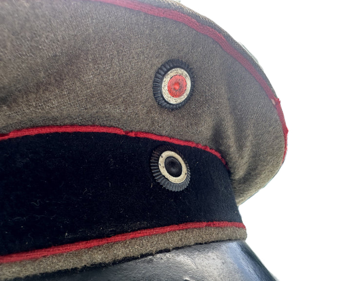 - Design: This Schirmütze features a black woolen band around the base and bright red piping that borders the crown, band, and visor seam, signifying its artillery association.