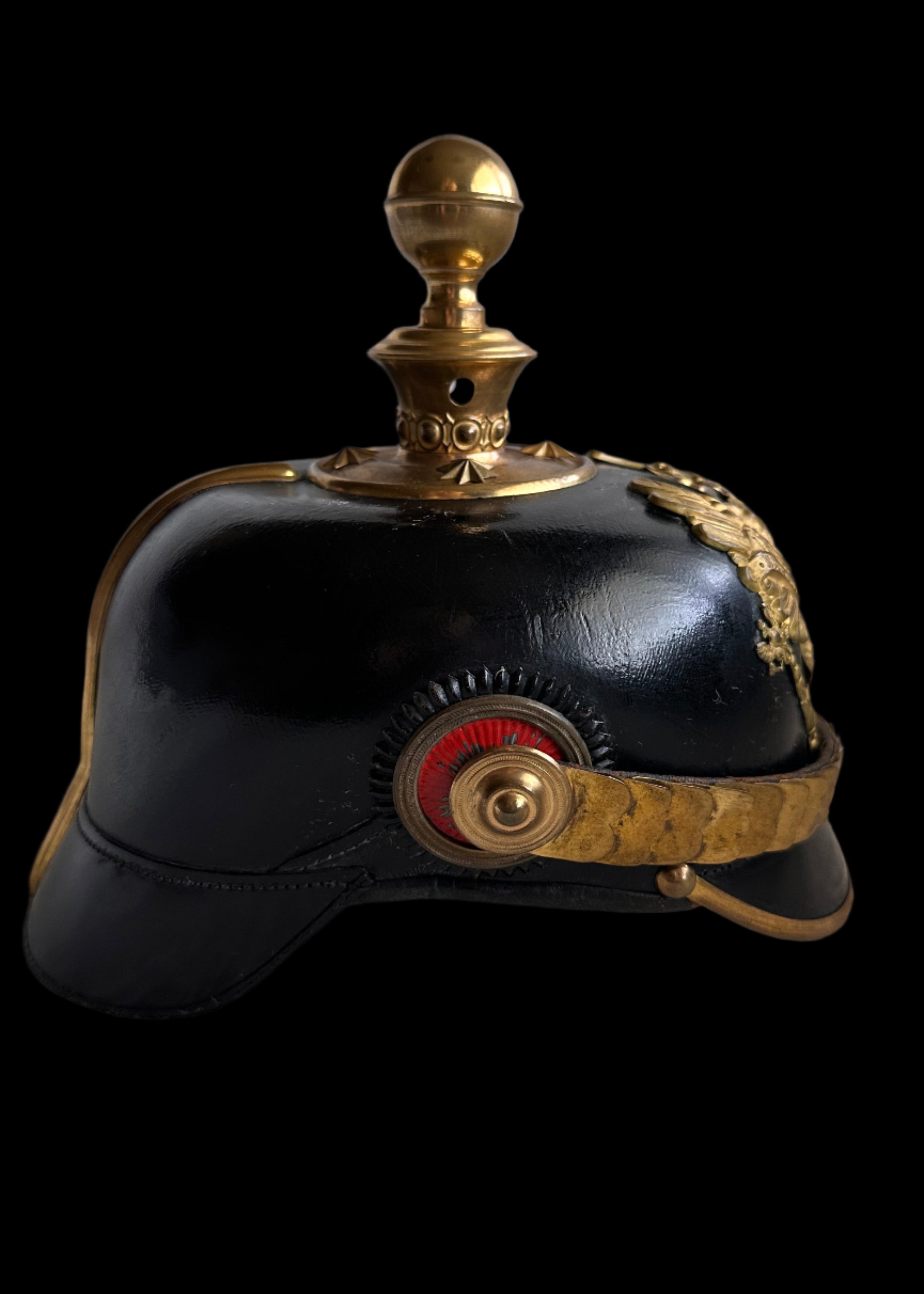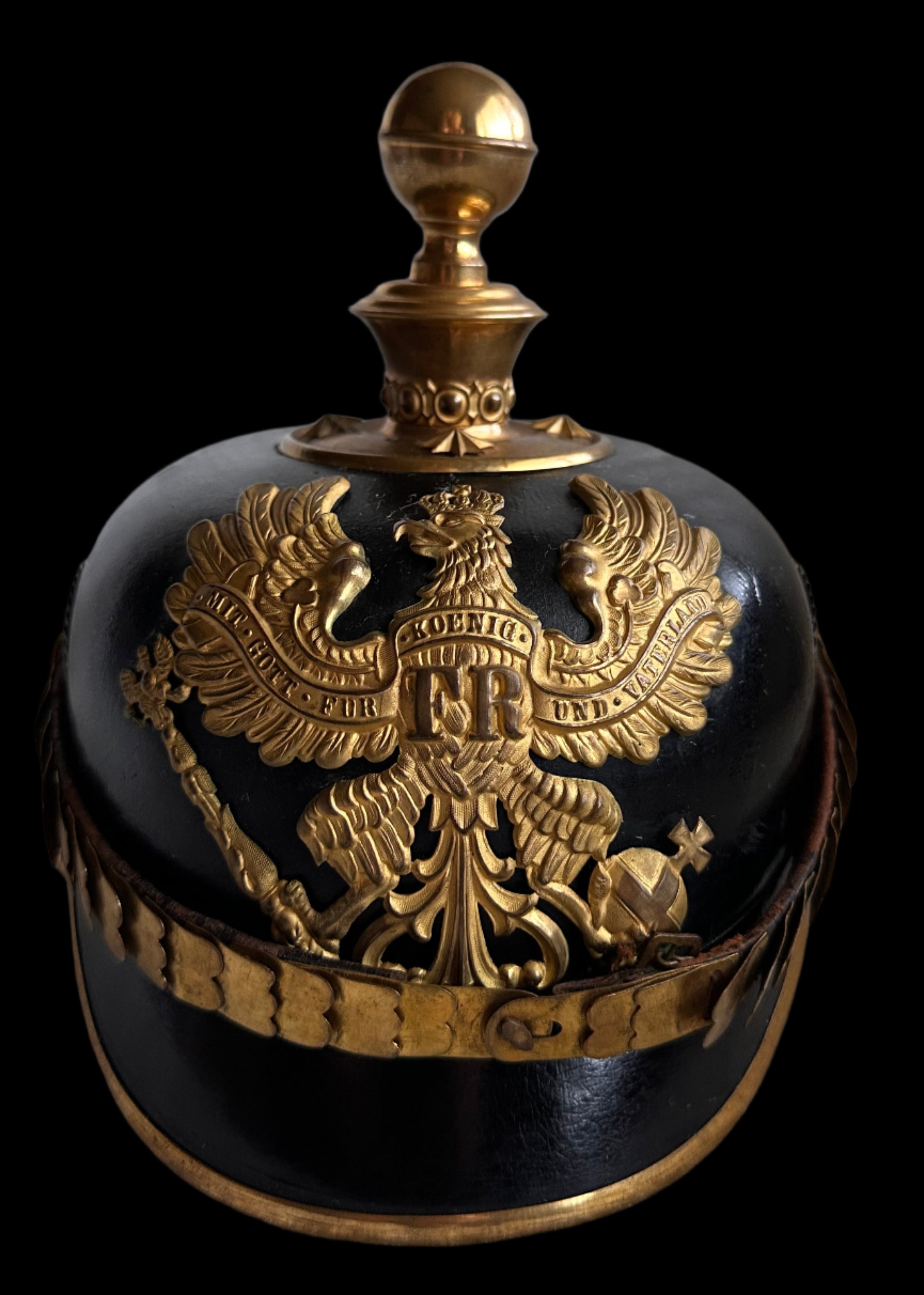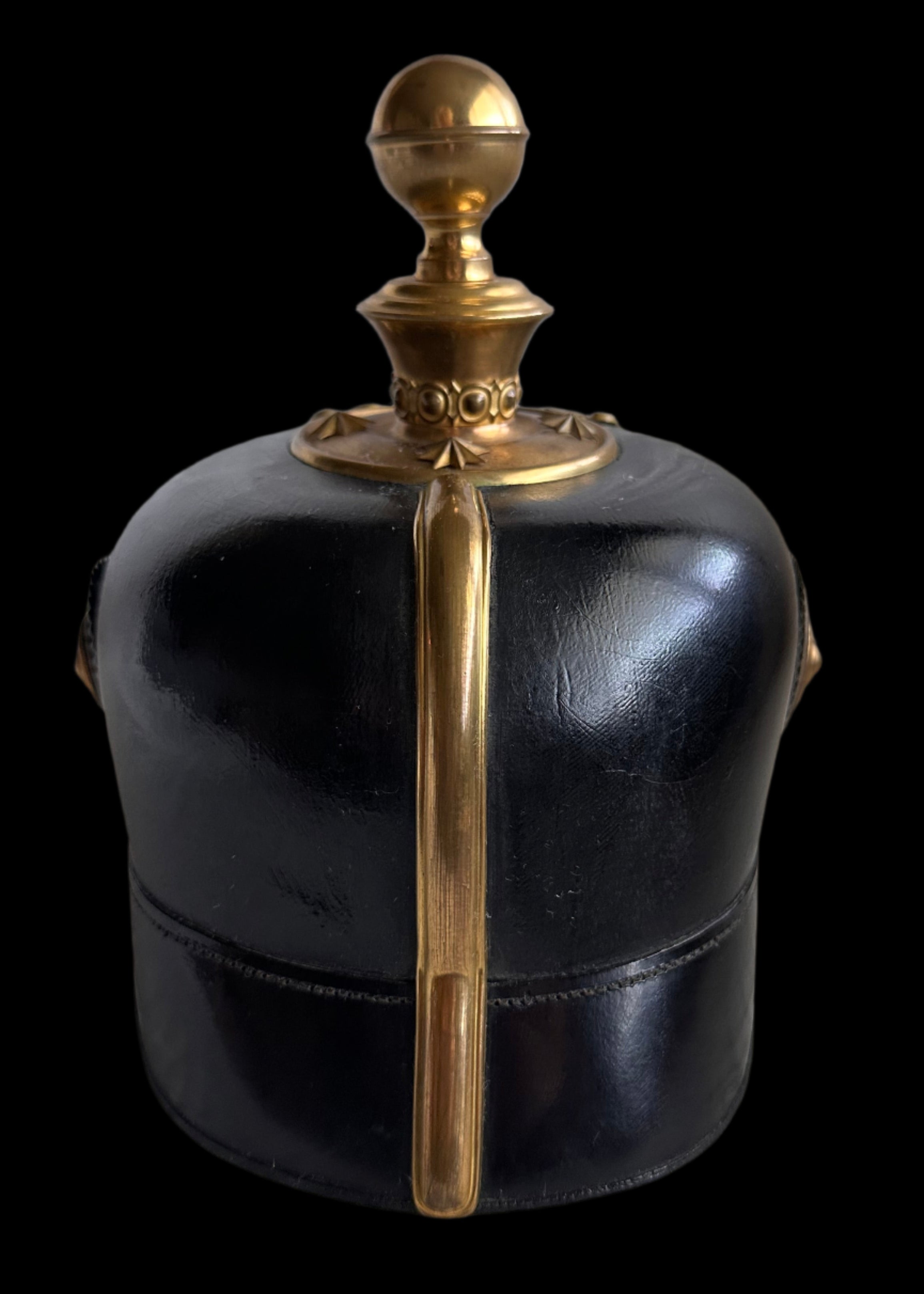 This helmet reflects a privately purchased officer model, likely ordered by a staff officer or regimental adjutant. Its elegant, restrained appearance — with the rounded finial and full gilt trim — projects authority without the aggressiveness of the pointed spike.