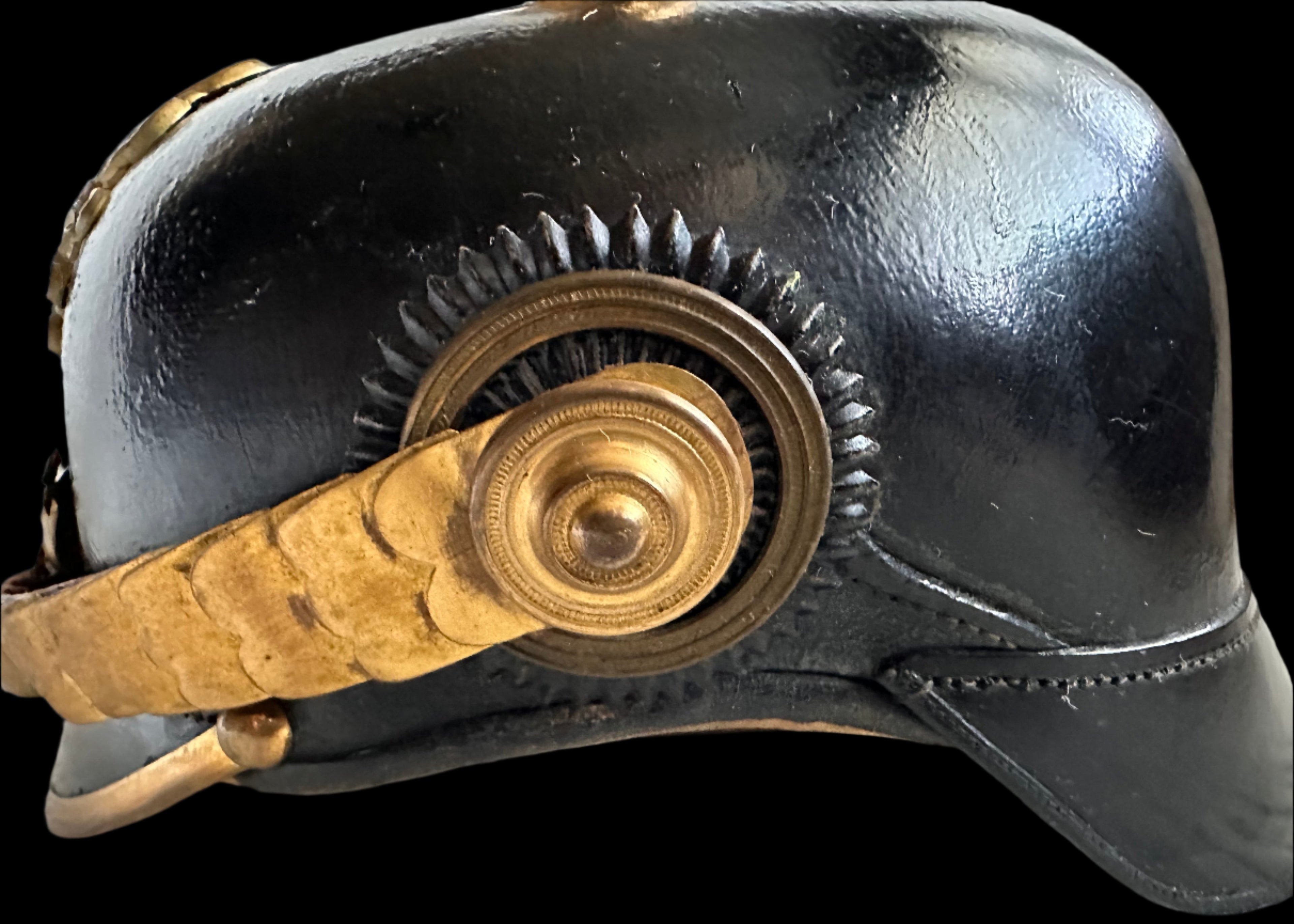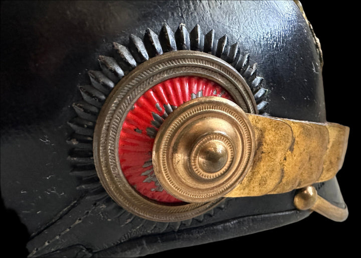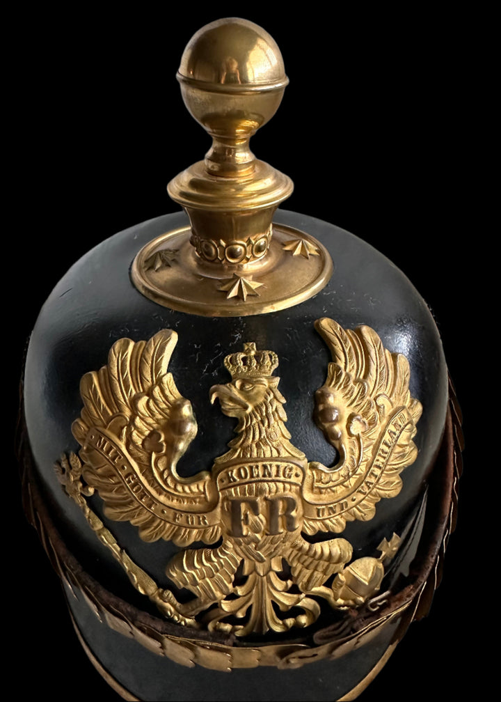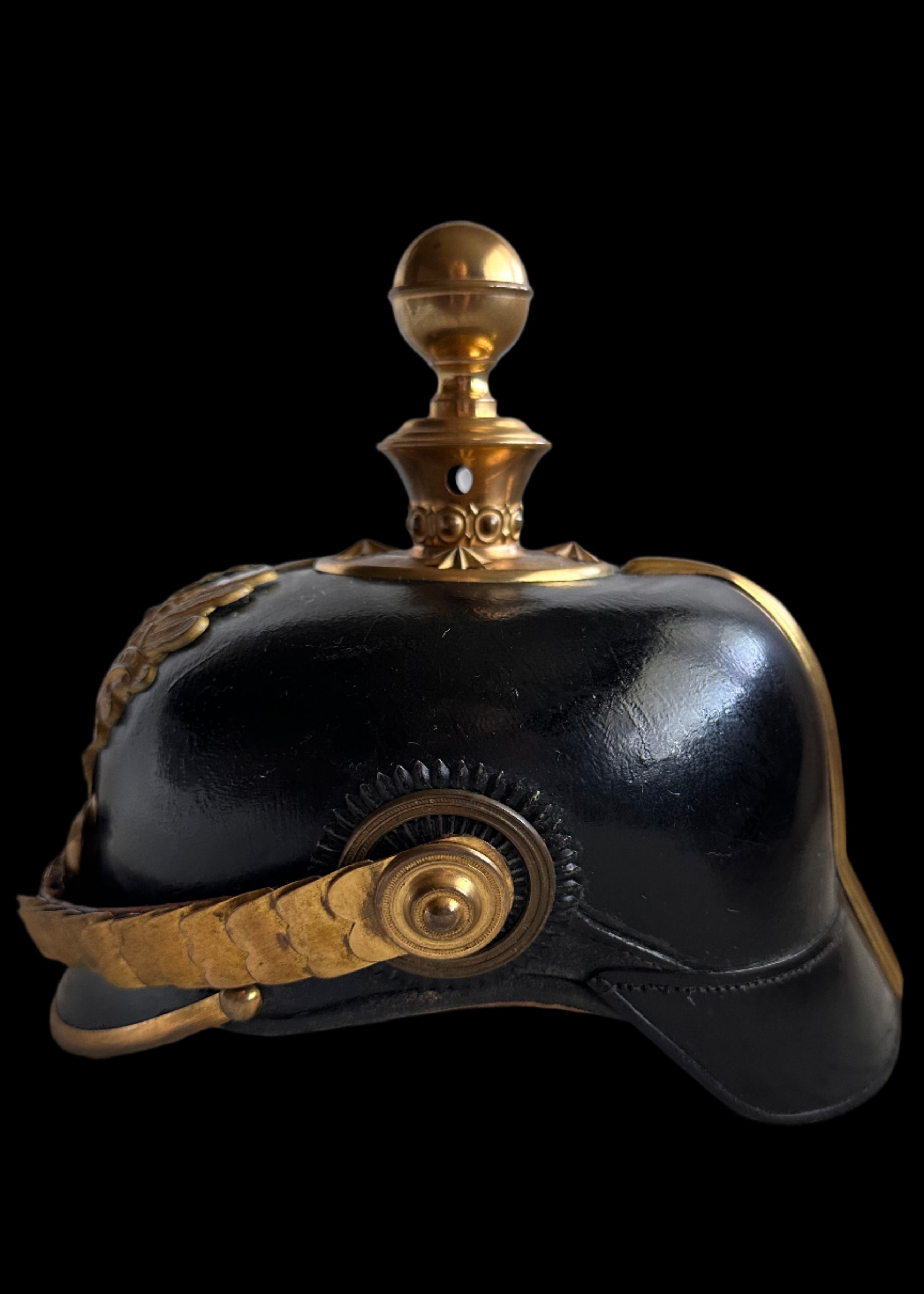 This helmet reflects a privately purchased officer model, likely ordered by a staff officer or regimental adjutant. Its elegant, restrained appearance — with the rounded finial and full gilt trim — projects authority without the aggressiveness of the pointed spike.