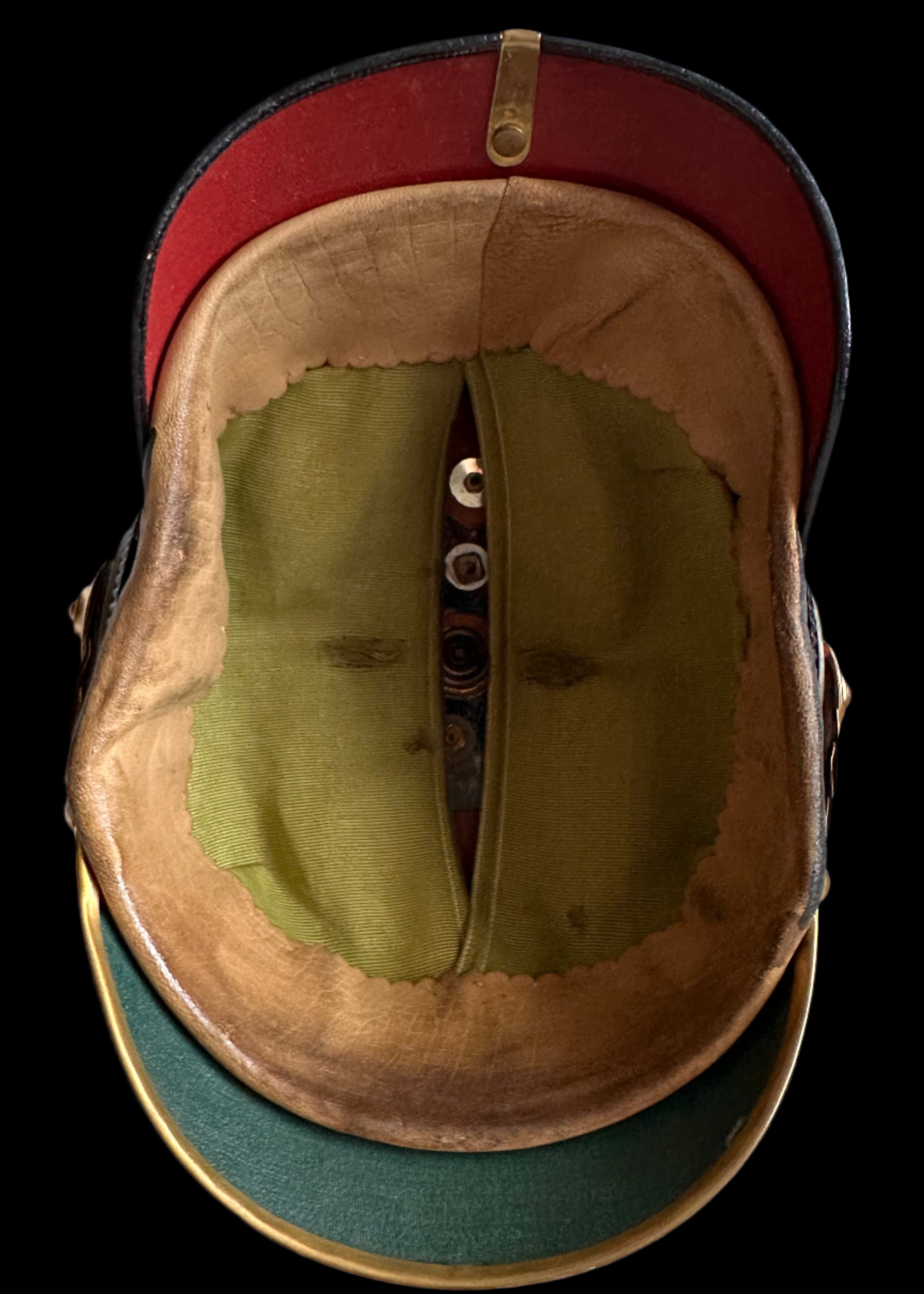 The presence of the line infantry eagle, rather than artillery or Train insignia, adds to the helmet’s rarity.