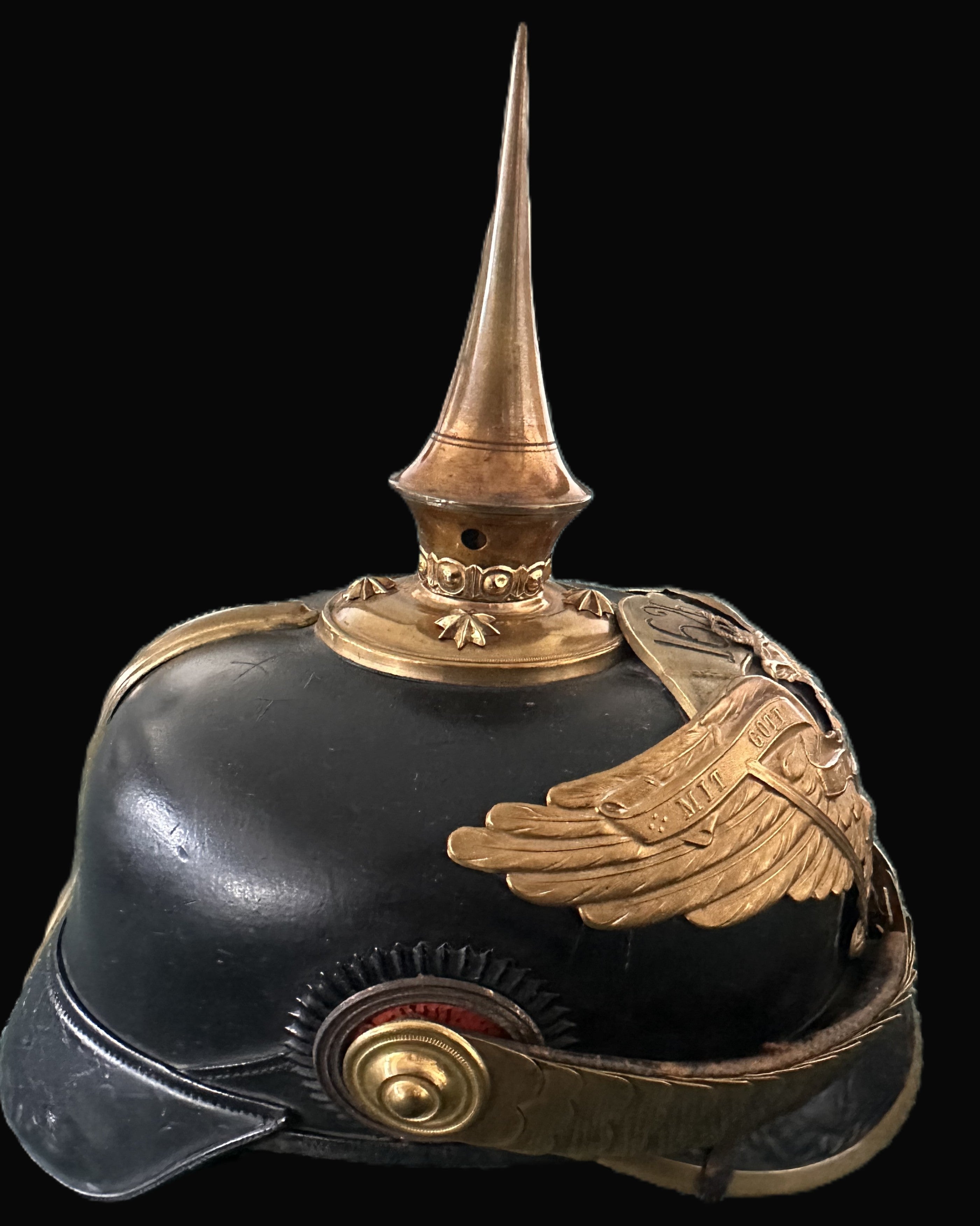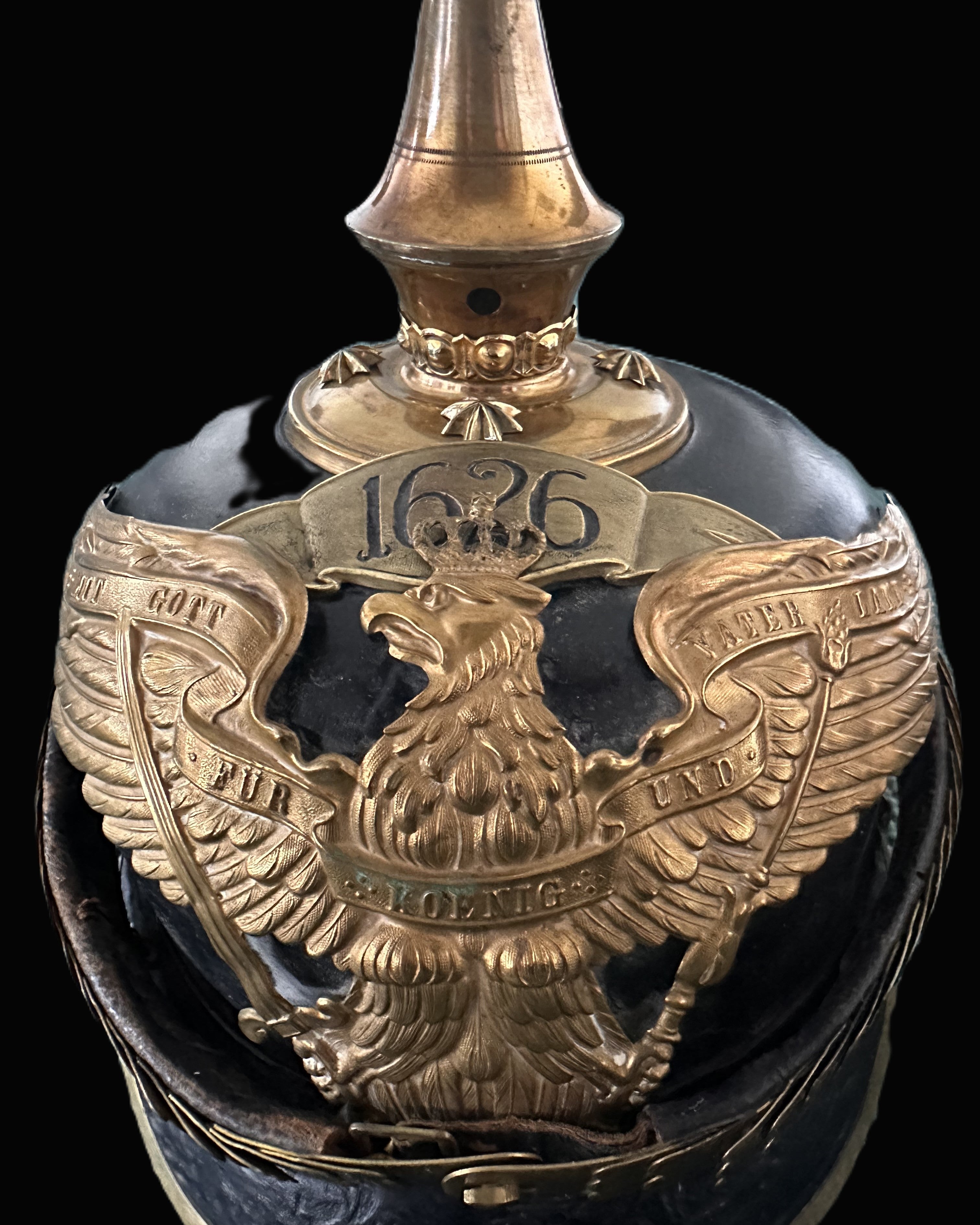 The helmet itself conforms to the officer’s model introduced circa 1911–1914, when the Grenadier regiments adopted the Grenadier Eagle pattern in place of earlier heraldic types. The eagle plate is executed in finely gilded metal, featuring outstretched wings and the central cypher “FWR” (Friedrich Wilhelm Rex), honoring King Frederick William I. Across its breast runs the familiar scroll “MIT GOTT FÜR KOENIG UND VATERLAND” (“With God for King and Fatherland”). Beneath the eagle’s claws, the sword and scepter are sculpted with precise attention to detail—the sword’s hilt showing the distinctive reverse S-curve characteristic of the Grenadier pattern. This differentiates it from the Guard Eagle, whose scepter terminates in a miniature eagle rather than the pinecone finial seen here.