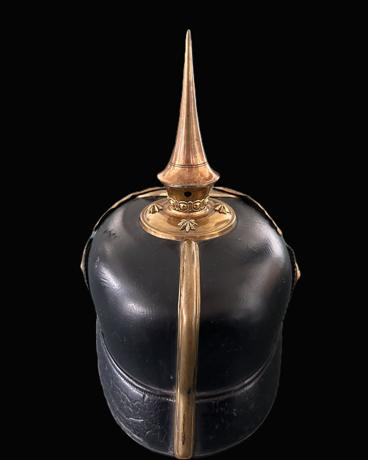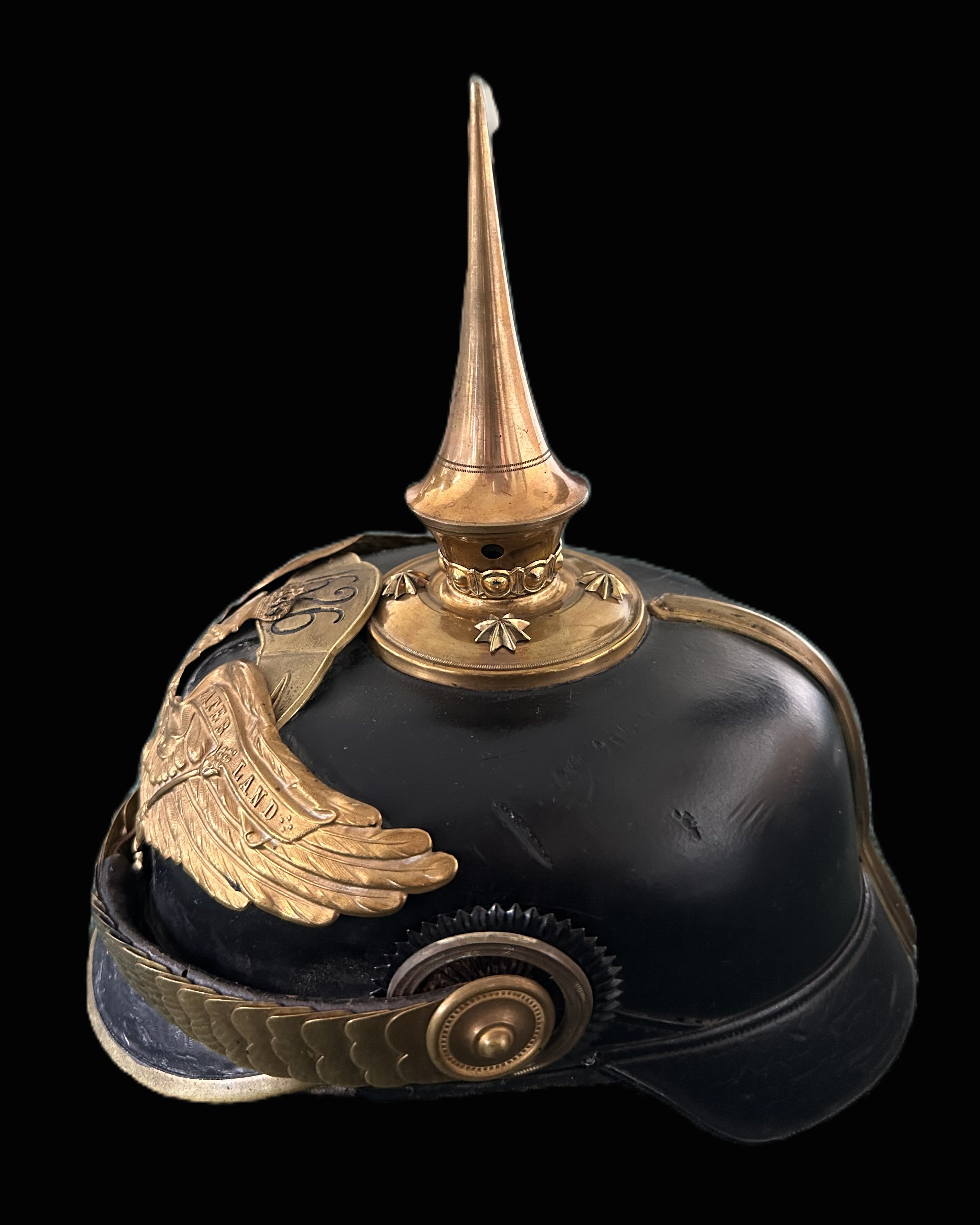 Condition is very fine to excellent, with original components throughout and no extra holes. The finish exhibits an attractive, lightly mellowed gilt surface and crisp detail to every chased element of the eagle. The interior remains remarkably clean. A scarce and handsome representative of one of Prussia’s oldest regiments, this Pickelhaube stands as a tribute to the enduring martial traditions of East Prussia.