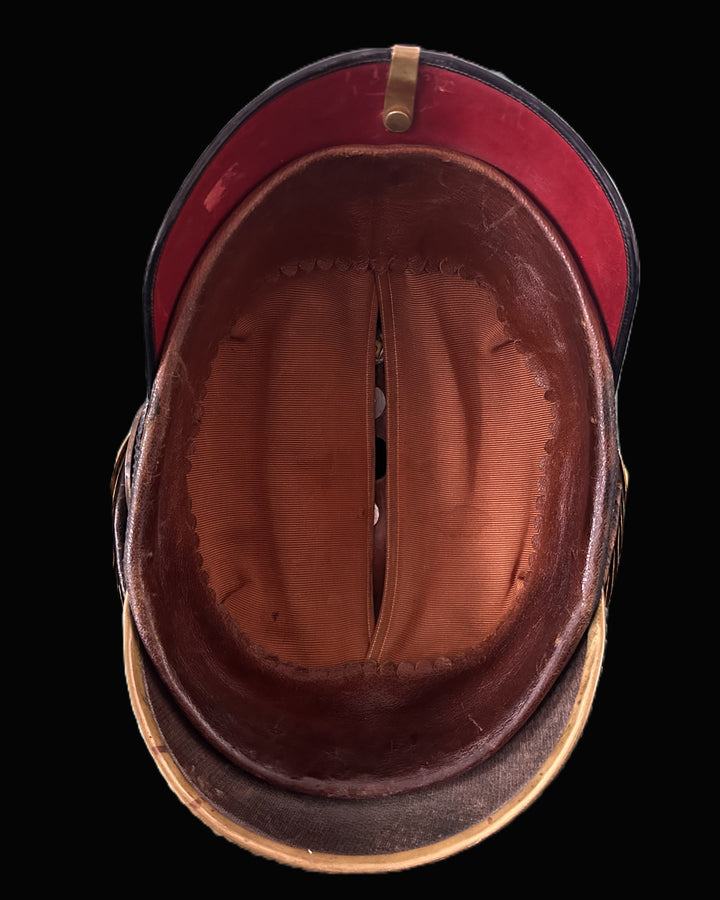 The helmet body is constructed of polished black lacquered leather with gilt brass trim throughout, including the officer’s spike, pearl ring, and cruciform base. The front visor is trimmed in bright gilt, while the rear visor bears matching metal edging. Side posts secure gilt chinscales on rosettes, mounted with correct Reich and Prussian officer kokarden. The spike itself is tall and elegantly fluted—a hallmark of prewar officer production. Inside, the helmet retains its complete russet-brown silk liner and supple leather sweatband, both of fine quality and free of tears or repairs. The helmet shows only mild surface aging to the lacquer—consistent with its age—and a rich, even toning to the gilt finish.