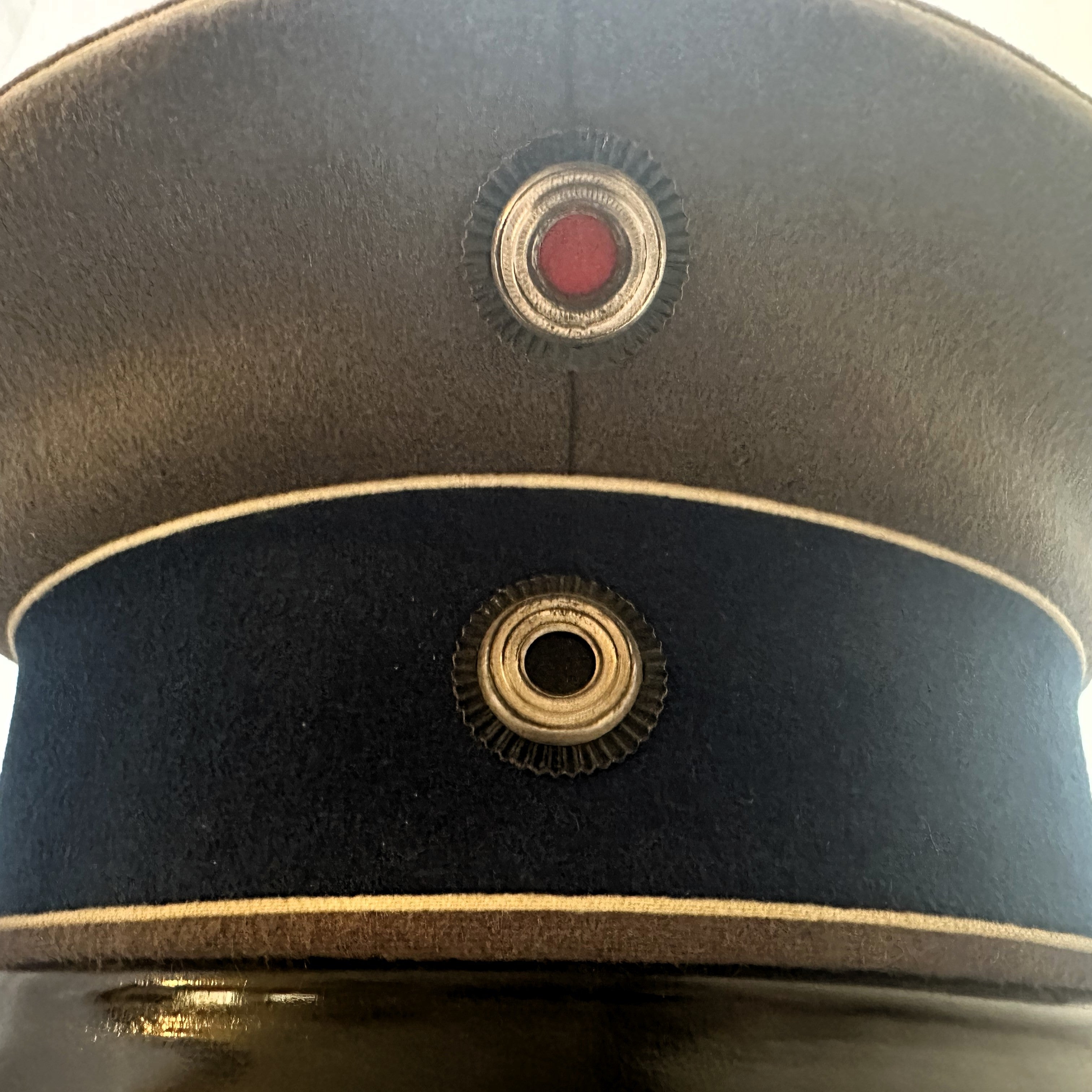 Kokarden (Cockades): Both the Prussian state kokarde and the Reich kokarde are present, positioned on the front of the cap. The Prussian kokarde is set higher on the band, just above the Reich kokarde, signifying the dual loyalty to both the Kingdom of Prussia and the German Empire.