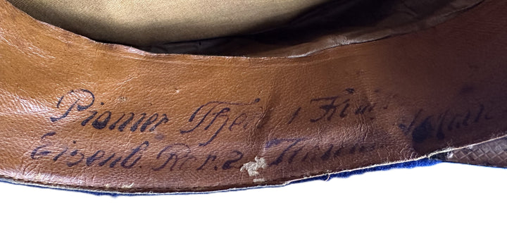 - Translations: The leather band is signed “Pionier Theis” and includes other regimental notations.
