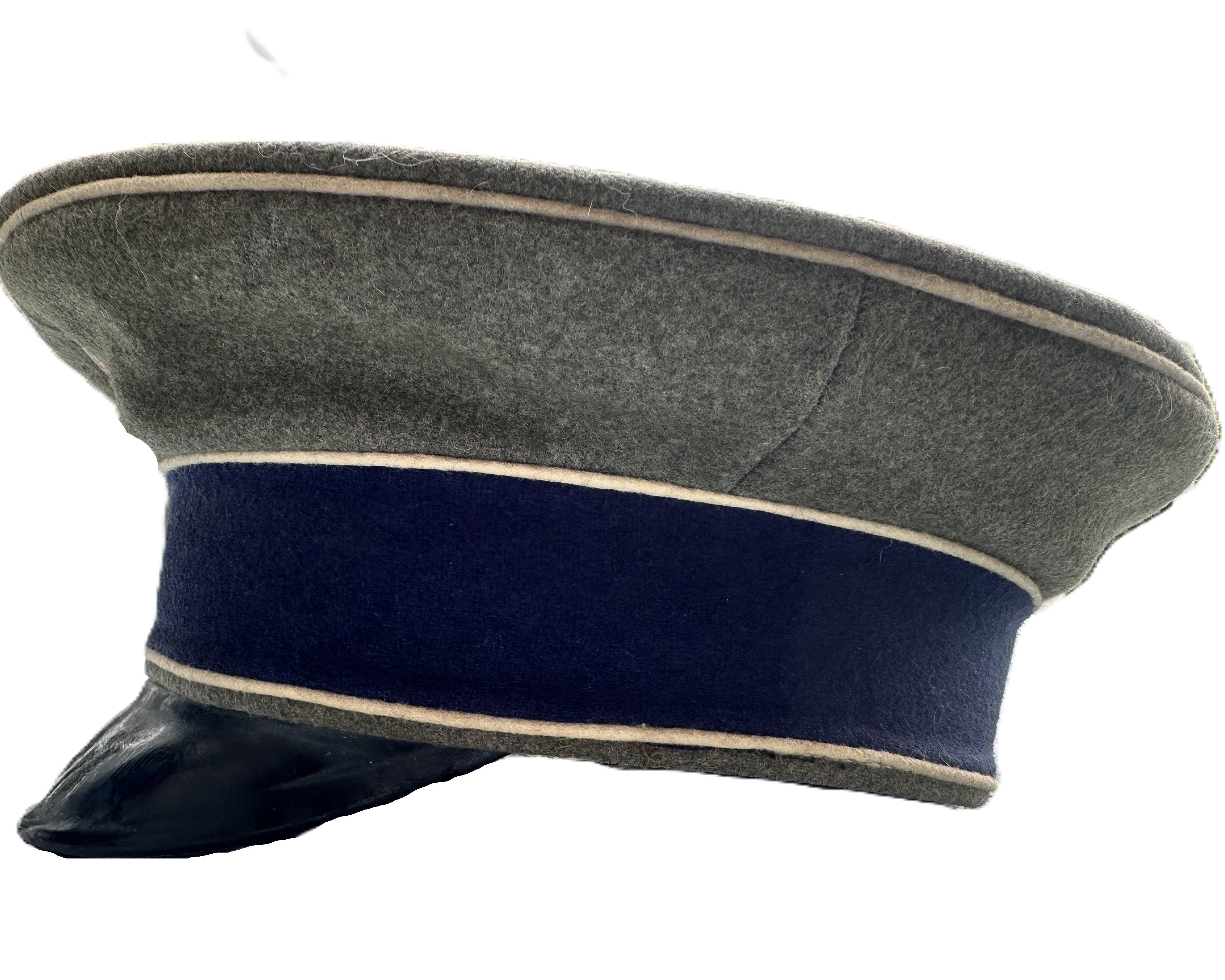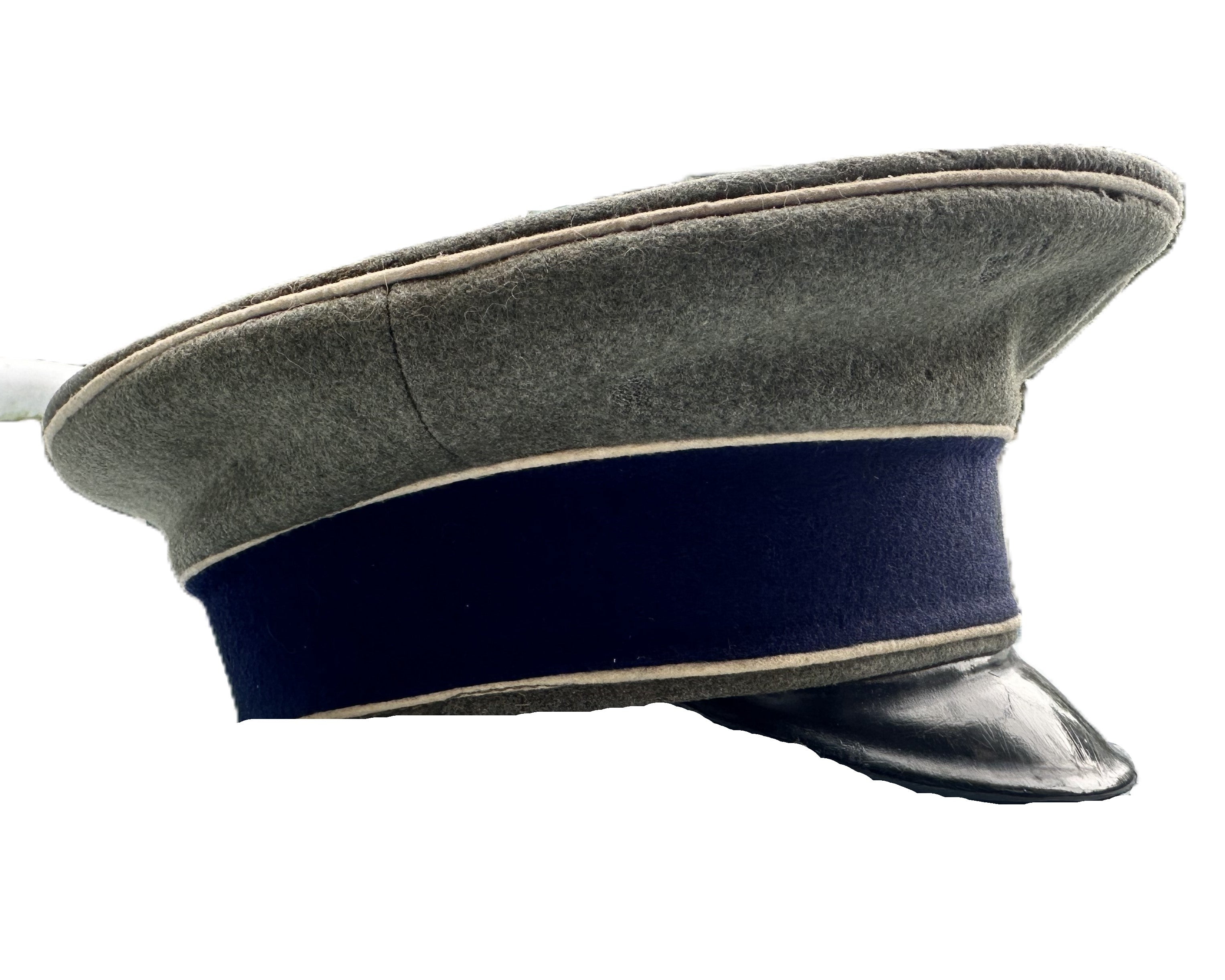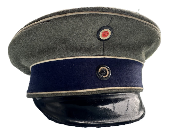 Condition: Given its age and field use, this Schirmmütze is in good condition, with some expected wear on the visor and interior lining. The wool retains its original color, and the cockades remain well-preserved, though the leather visor shows cracking typical of items over a century old.