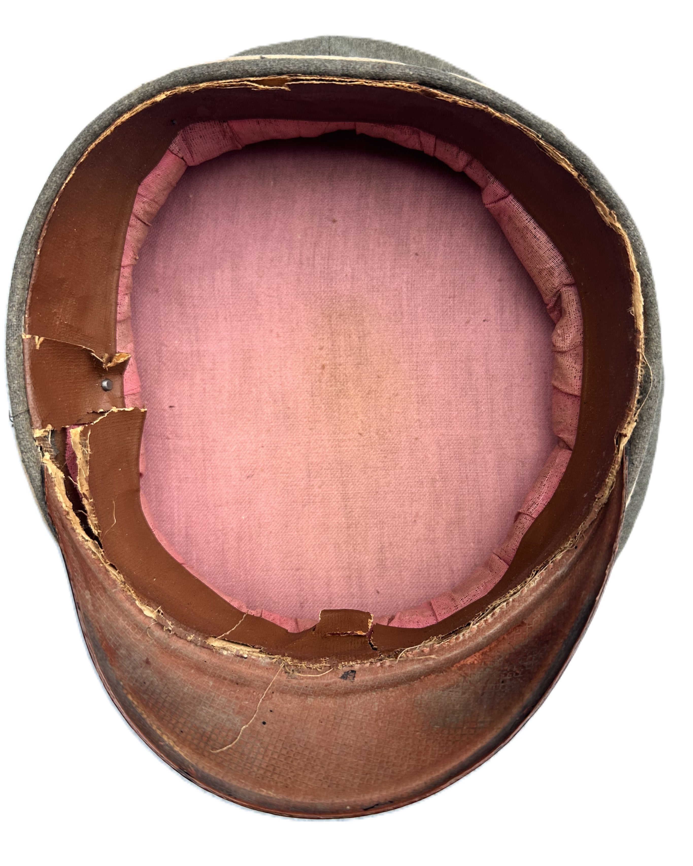 Interior: The interior of the cap shows typical wear, with a pinkish lining indicative of prolonged field use. The condition is representative of a cap used in service, making it a genuine artifact of historical interest.