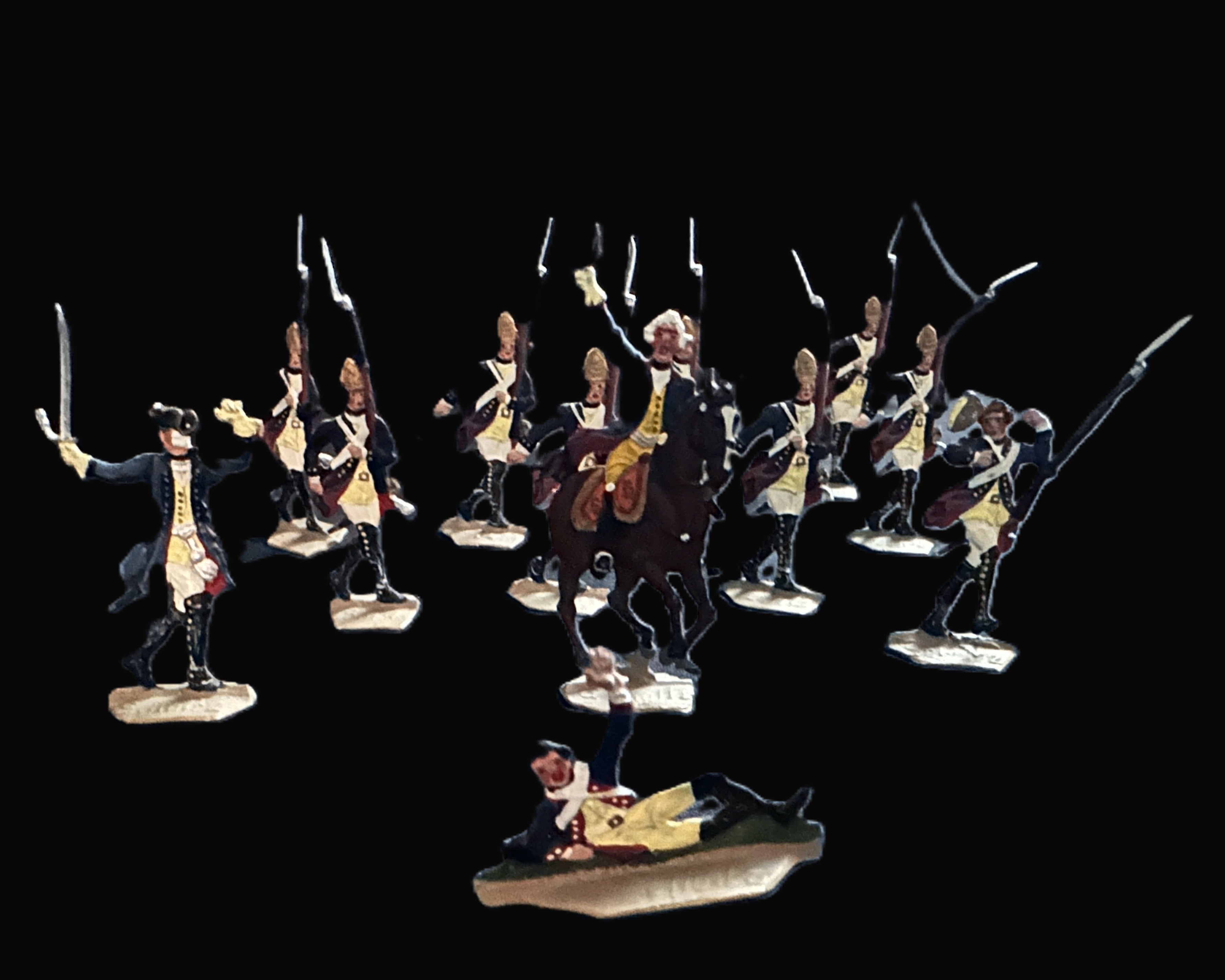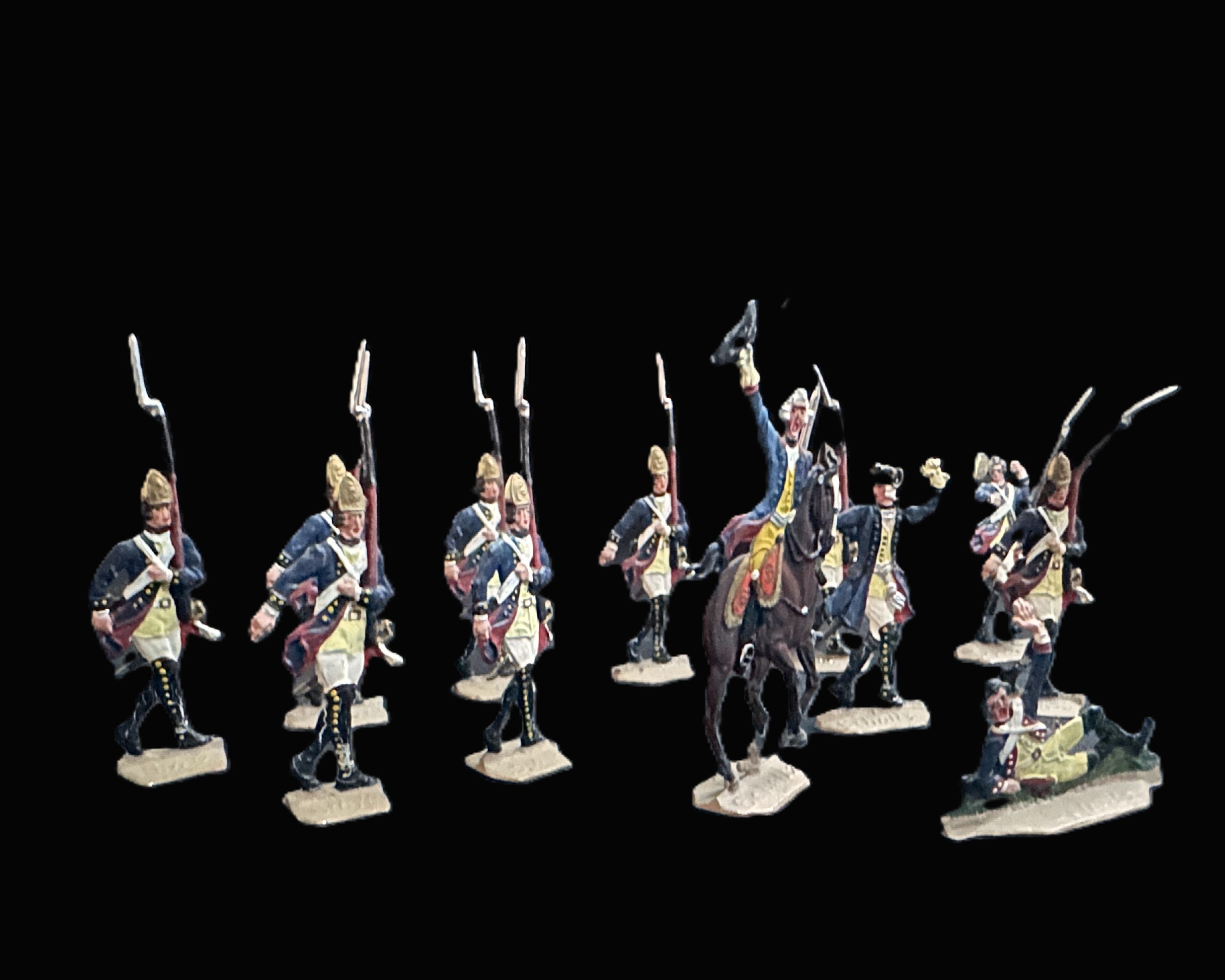 Total of 12 figures: marching grenadiers, officers, mounted commander, and one casualty figure.