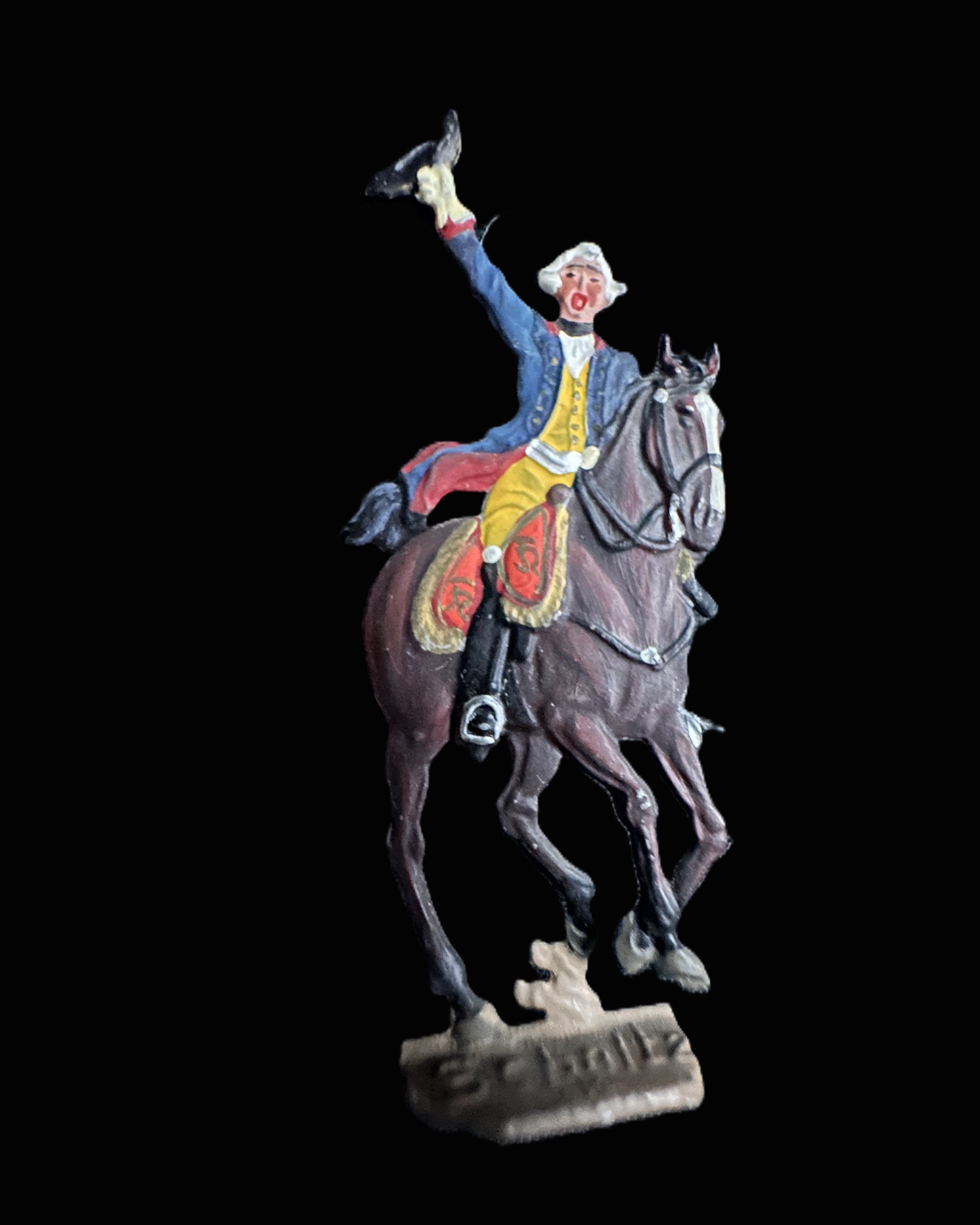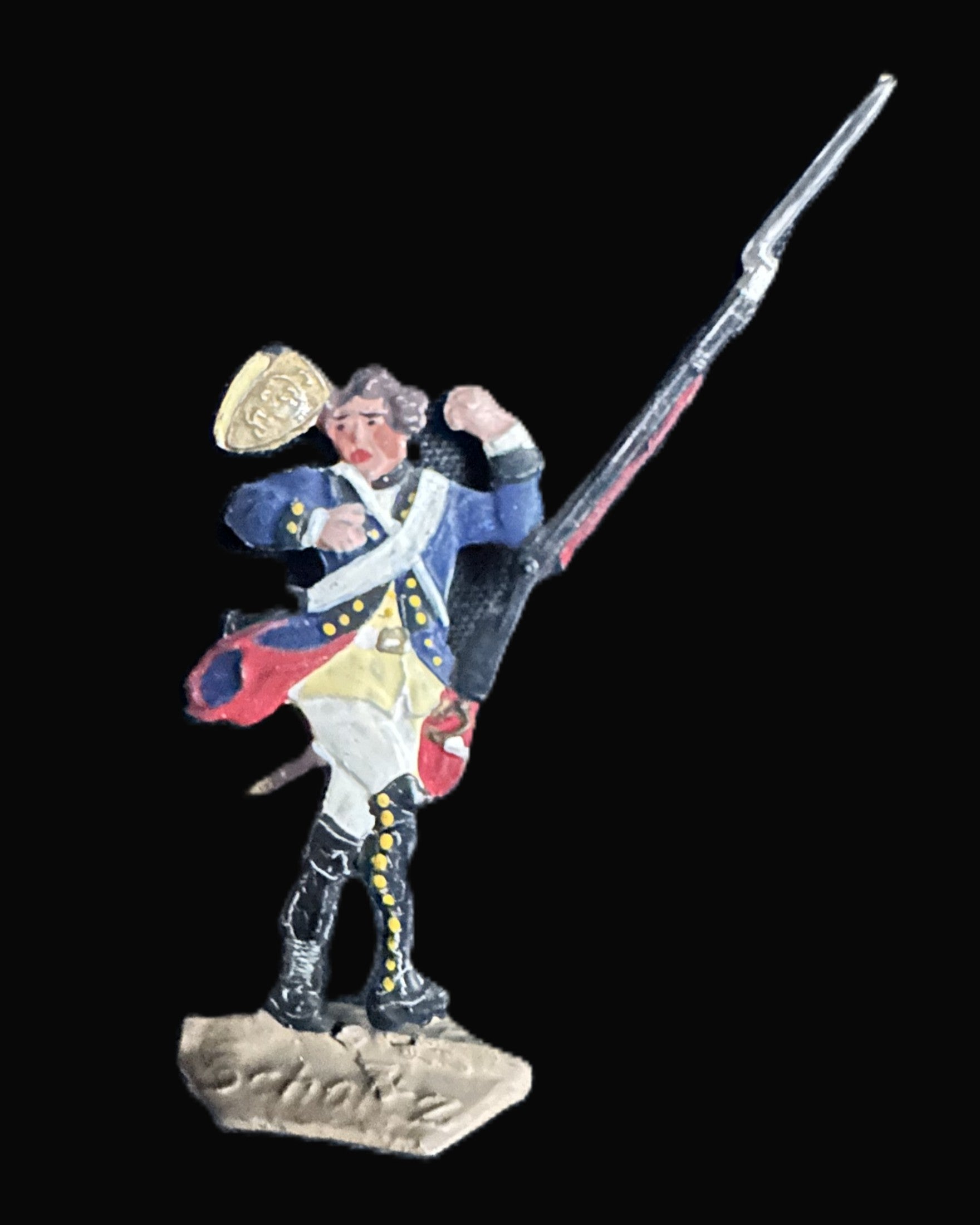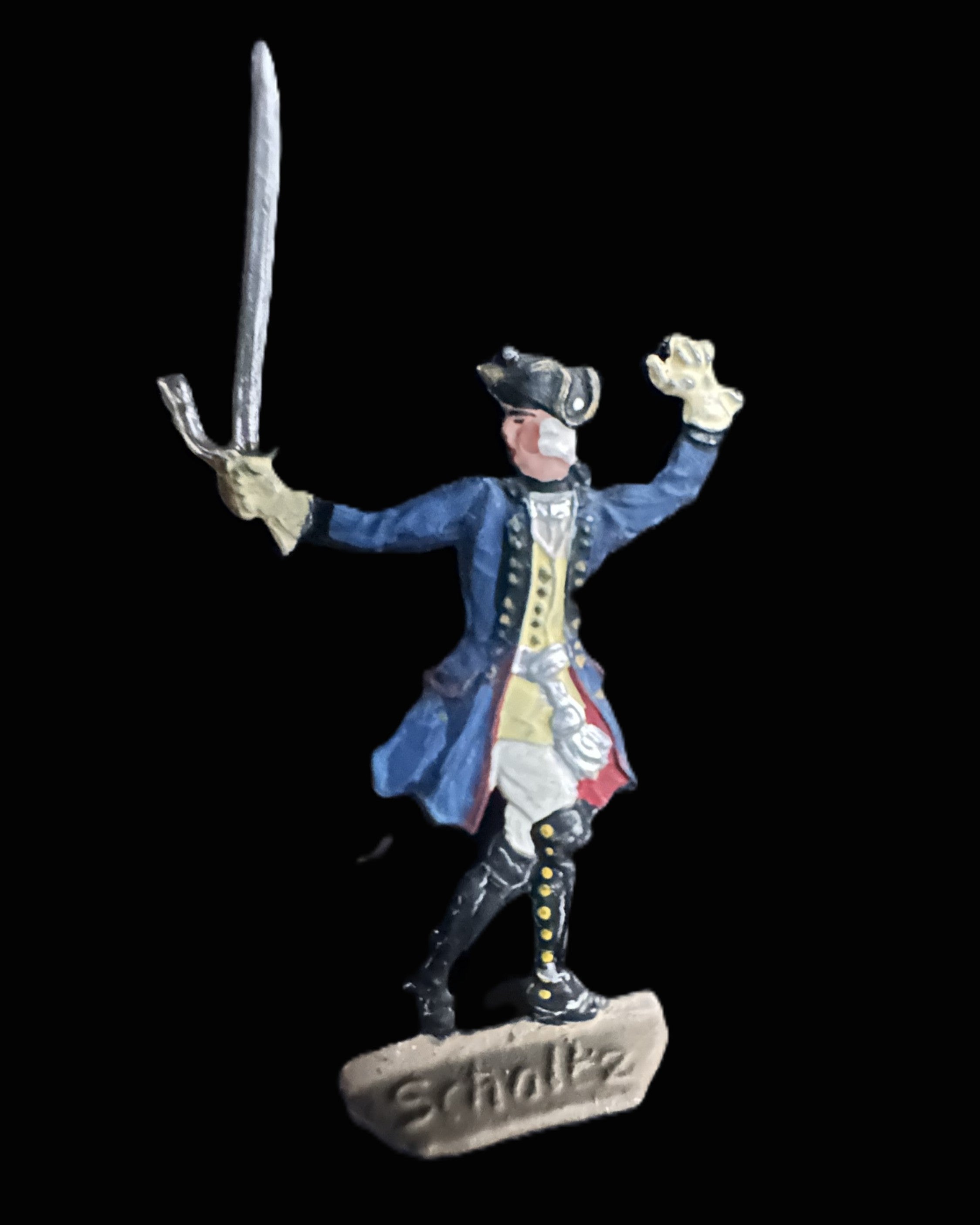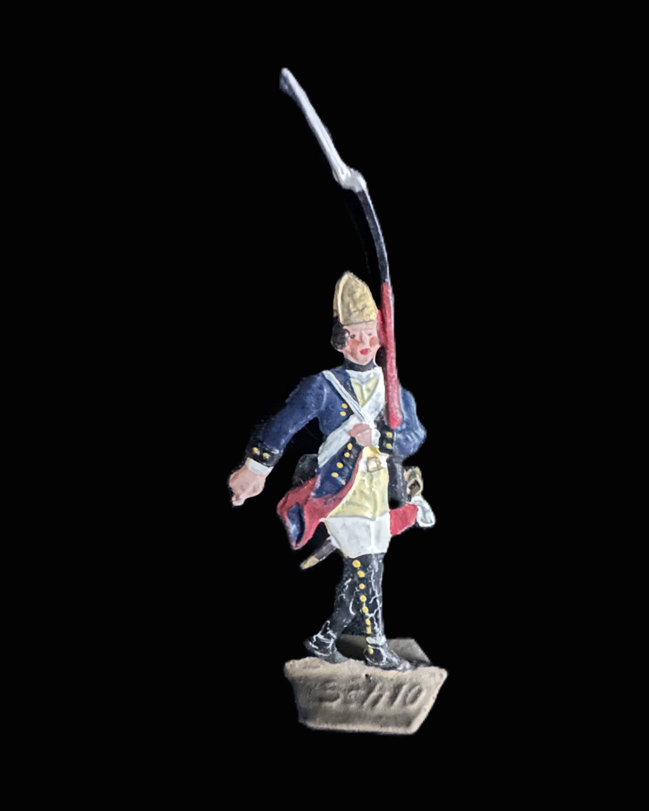 These figures represent Frederick the Great’s disciplined infantry, famed throughout Europe for their rigid drill and battlefield effectiveness. The grenadiers in mitre caps evoke the elite battalions that served as shock troops during decisive battles such as Rossbach (1757) and Leuthen (1757). The inclusion of a mounted officer reflects Frederick himself or his senior commanders, who often led from horseback at the center of the line. Makers Scholtz and Spiro were both part of the great German tradition of toy soldier production in the late 19th and early 20th centuries, carrying forward the fascination with Prussia’s military heritage.
