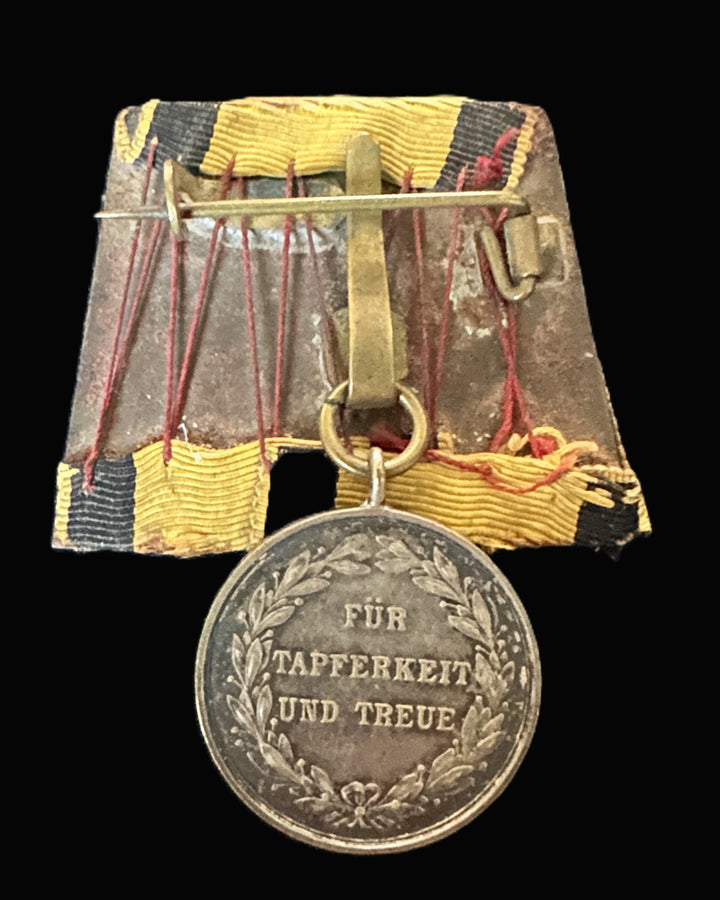 From a collector’s standpoint, this example is especially appealing due to its untouched condition and correct period assembly. The medal has not been cleaned or artificially brightened; the surfaces show natural oxidation and patina consistent with age. The ribbon, though worn and frayed in places, is original and complete—attributes strongly favored by advanced collectors who prioritize authenticity over cosmetic perfection.