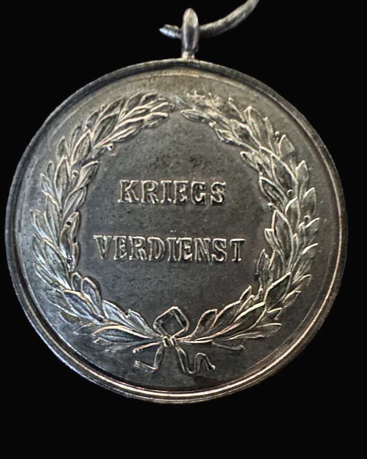 The medal is struck in silvered metal, circular in form, with a raised rim and a neatly fitted suspension loop and ring. The obverse displays the crowned royal cipher “W” for Wilhelm, executed in flowing script and surrounded by decorative flourishes. The crown is crisply detailed, indicating a quality official strike rather than a private or souvenir piece. The reverse bears the inscription “KRIEGS VERDIENST” in two lines, encircled by a laurel wreath tied at the base with a ribbon bow. The lettering and wreath remain sharp, with only light softening from age. The ribbon shows honest period wear, including fraying, fading, and handling marks, but remains intact and correctly attached, reinforcing its originality.