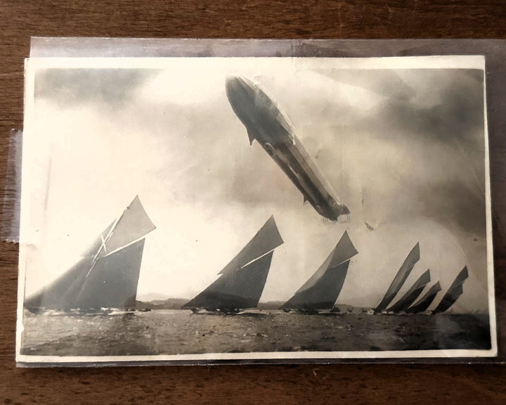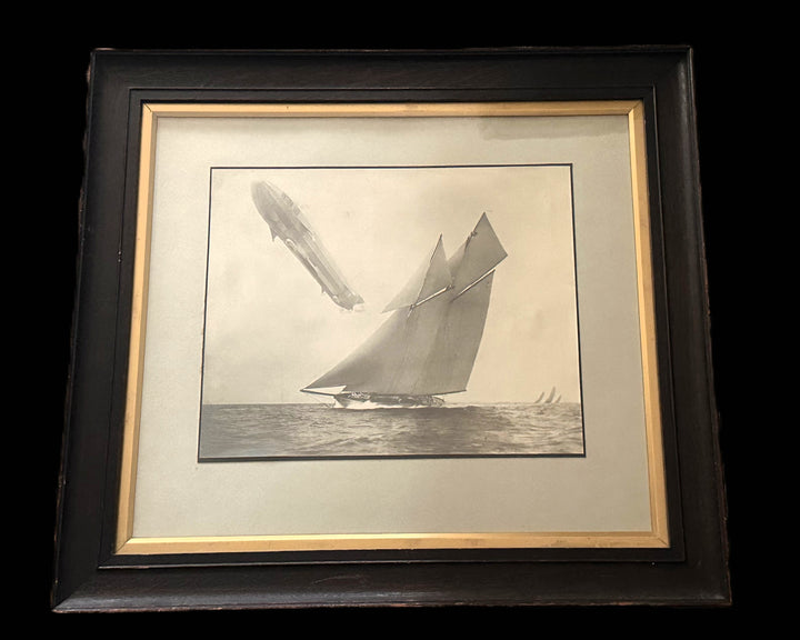 This extraordinary, professionally framed photograph captures a surreal juxtaposition of maritime grace and aerial innovation — a rigid German Zeppelin soaring above a fleet of racing yachts, most likely from the pre-WWI or early interwar period. The scene presents a stunning collision of two defining technological pursuits of the era: seafaring sport and airship mastery.