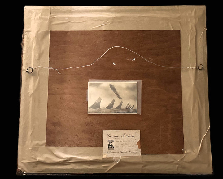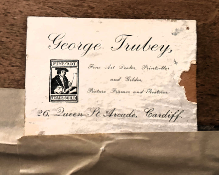 A framed label from George Trubey, fine art dealer and restorer based at 26 Queen Street Arcade, Cardiff, authenticates the item's historic handling. Trubey was active in the early-to-mid 20th century and associated with the Fine Art Trade Guild.