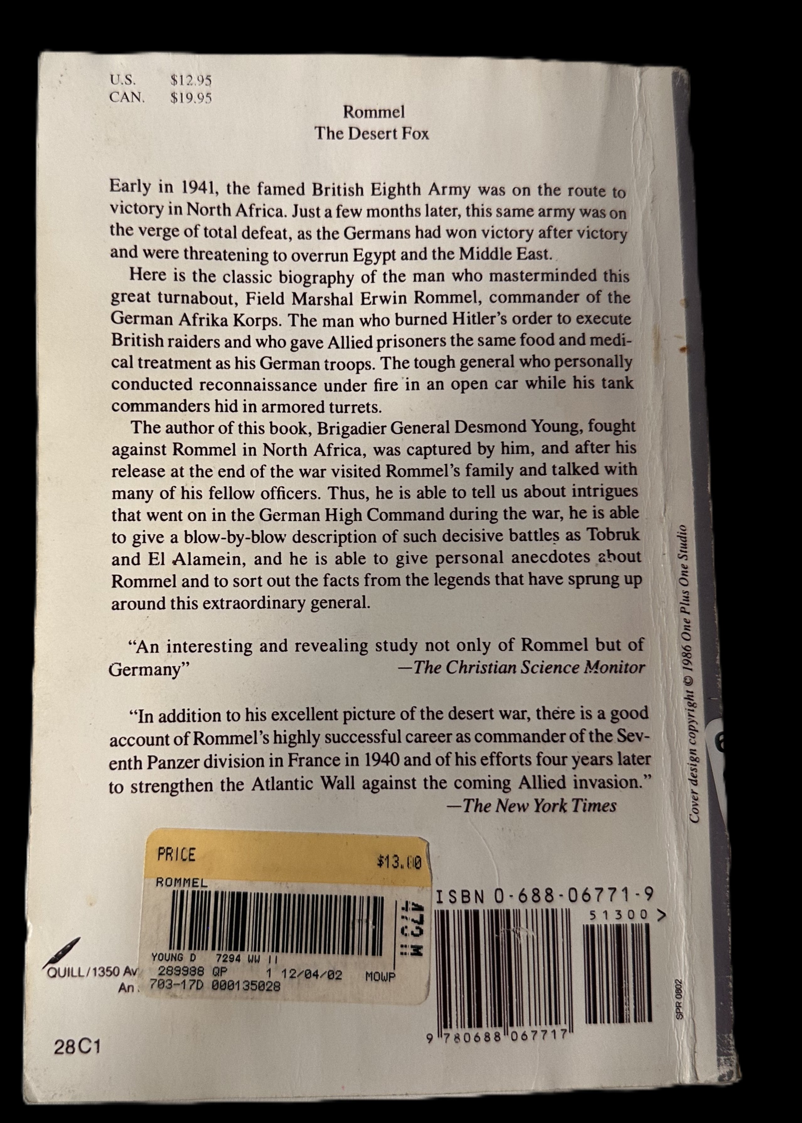 This compelling paperback edition of Rommel: The Desert Fox by Brigadier General Desmond Young offers a penetrating portrait of one of WWII’s most controversial and brilliant military leaders: Field Marshal Erwin Rommel. Known as “The Desert Fox” for his leadership of the German Afrika Korps, Rommel became a symbol of tactical genius and soldierly honor—even among his enemies.