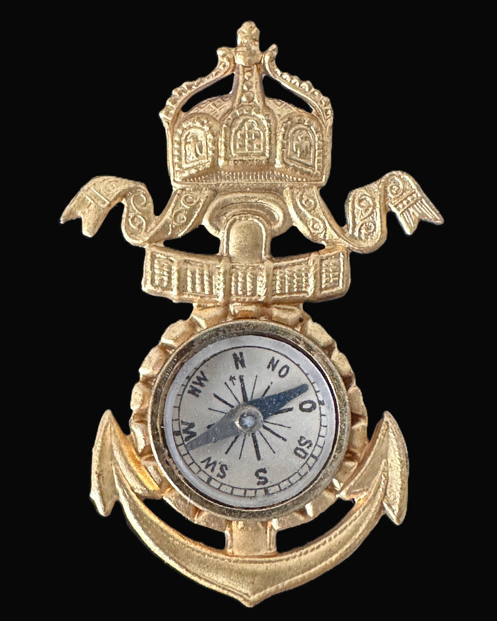 This is a finely crafted Royal Navy officer’s compass brooch, a unique piece that blends both functionality and symbolism. The brooch features a detailed, gilded brass construction, prominently displaying a crowned fouled anchor, the classic emblem of the Royal Navy.