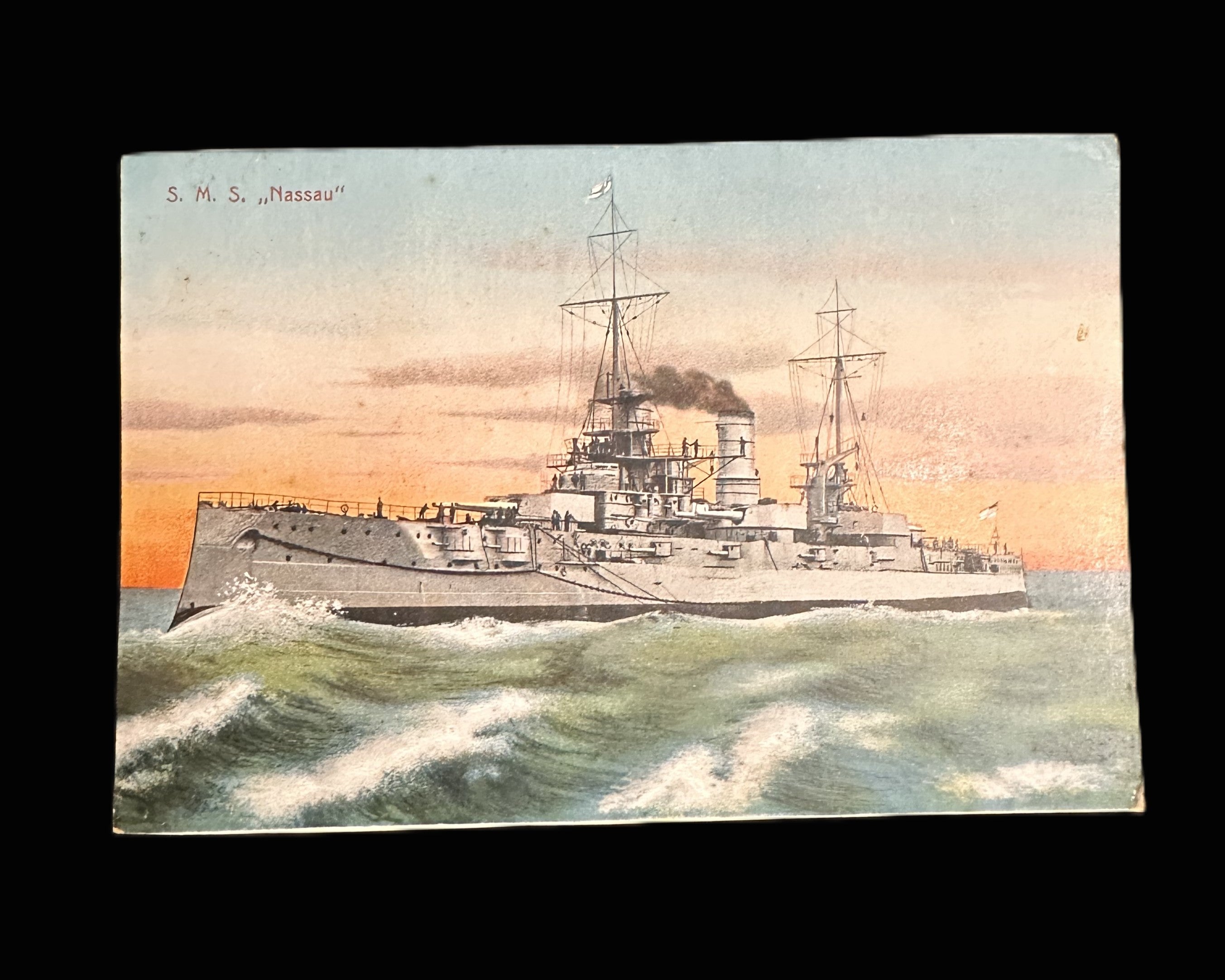 S.M.S. Nassau Ship Tally with Period Postcard, Imperial German Navy
