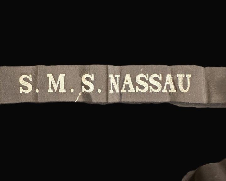 S.M.S. Nassau was the lead ship of the Nassau-class battleships and represented Germany’s first true dreadnought design, marking a major shift in Imperial German naval power during the pre-war naval arms race. Ship tallies bearing specific capital ship names were worn by sailors assigned to those vessels and are among the most personal and evocative identifiers of naval service in the Imperial period. Tallies tied to named capital ships are significantly scarcer than generic navy tallies, particularly when retaining clear legibility.