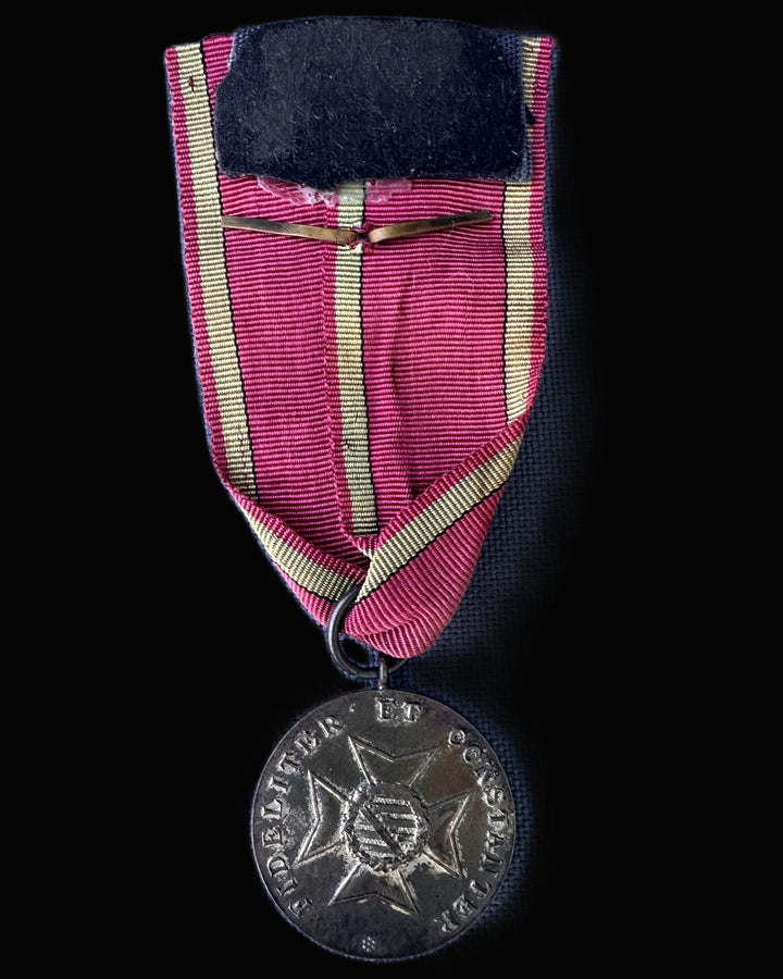 Suspended from a beautifully preserved red moiré silk ribbon with central and edge yellow stripes, this example includes the crossed swords device pinned to the ribbon, denoting a military issue during World War I. This variant signifies wartime merit rather than peacetime civil service.