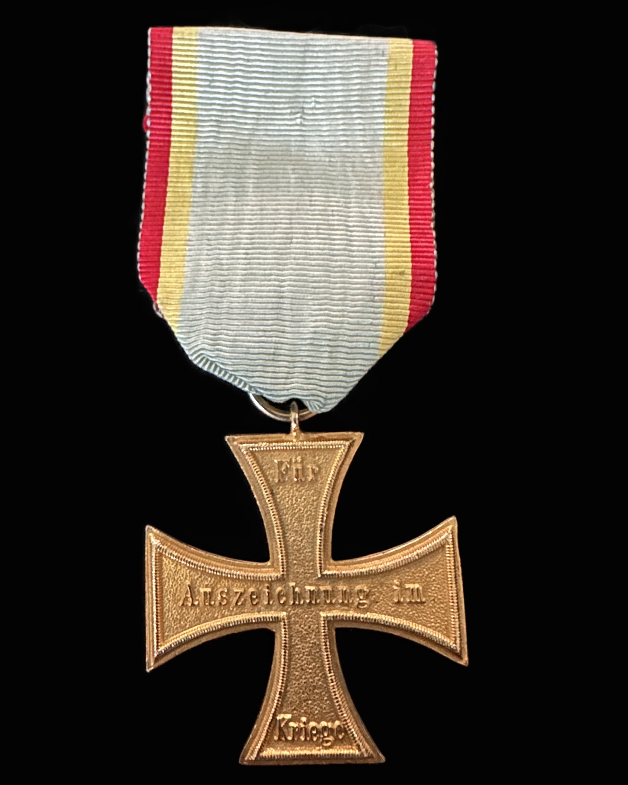Offered here is a fine example of the War Merit Cross (Kriegsverdienstkreuz) from the Grand Duchy of Saxe-Weimar-Eisenach, a seldom-encountered decoration from one of Imperial Germany’s smaller states. Instituted in January 1915 by Grand Duke Wilhelm Ernst, this cross recognized both military and civil contributions to the German war effort during the First World War.