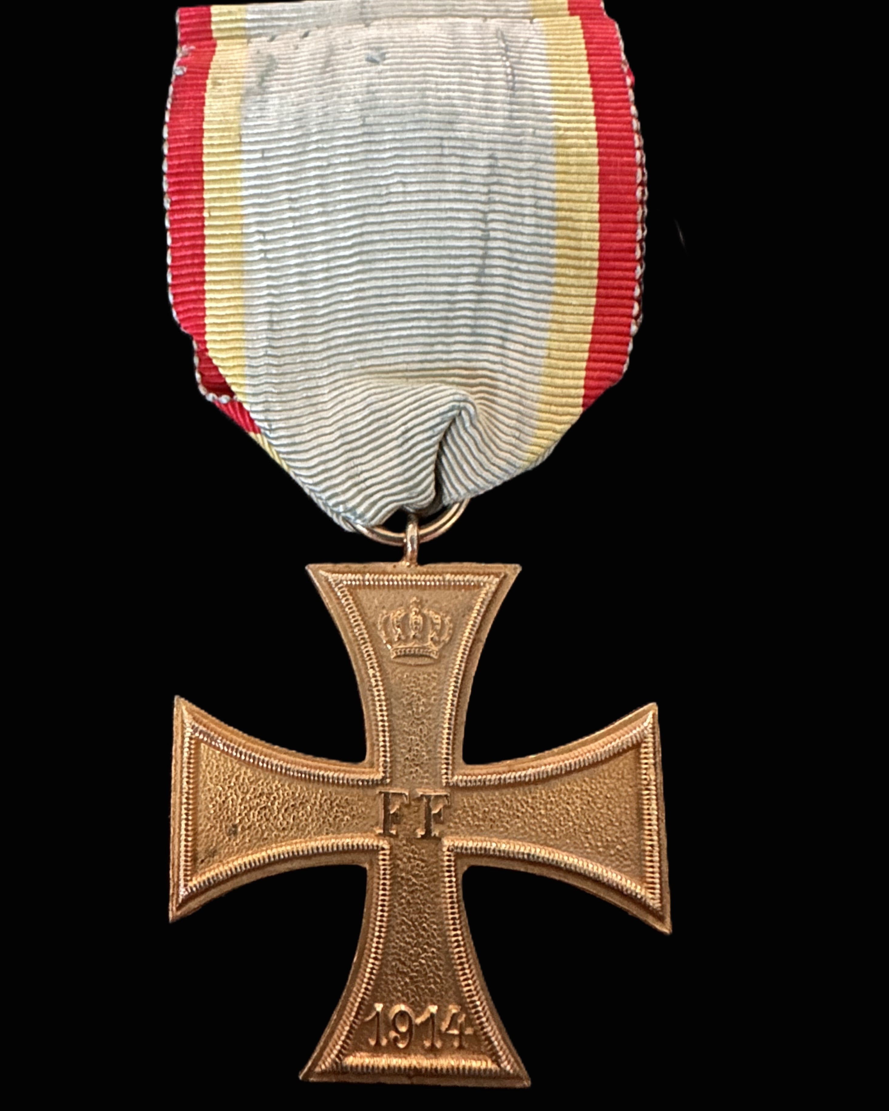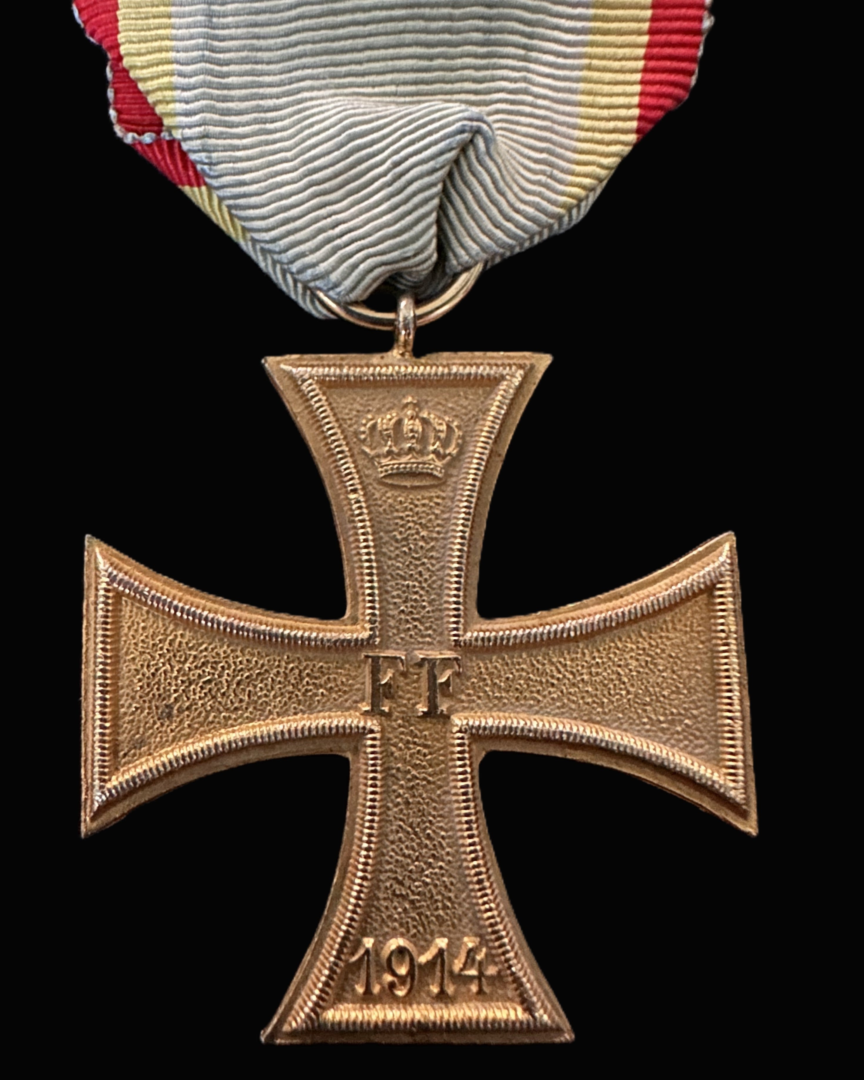 The cross is struck in gilded bronze with excellent definition and retains much of its original luster. The obverse bears the inscription “Für Auszeichnung im Kriege” (“For Merit in War”), framed by the bold arms of the cross. The reverse features the crowned cipher “WE” (for Wilhelm Ernst) above the date 1914, denoting the year of Germany’s entry into the war.