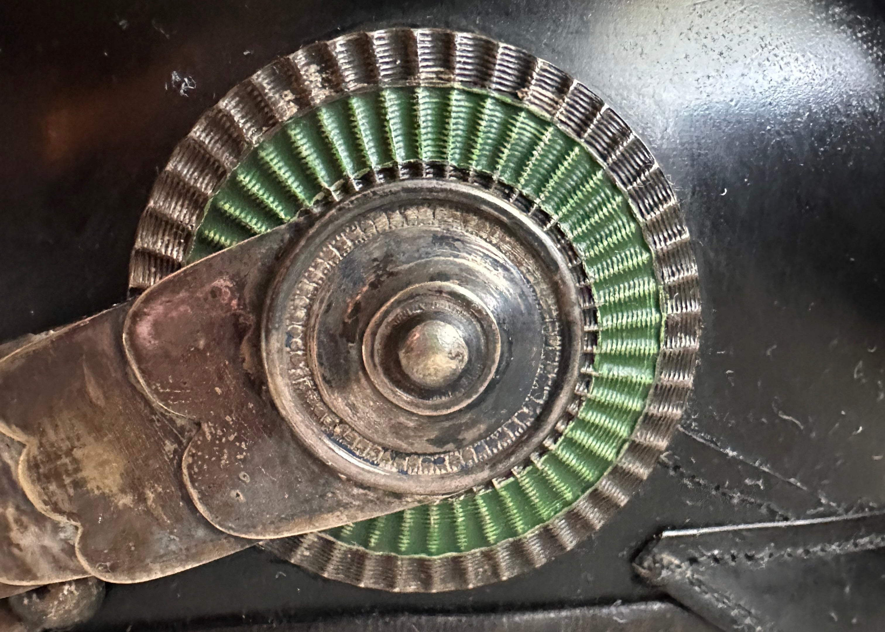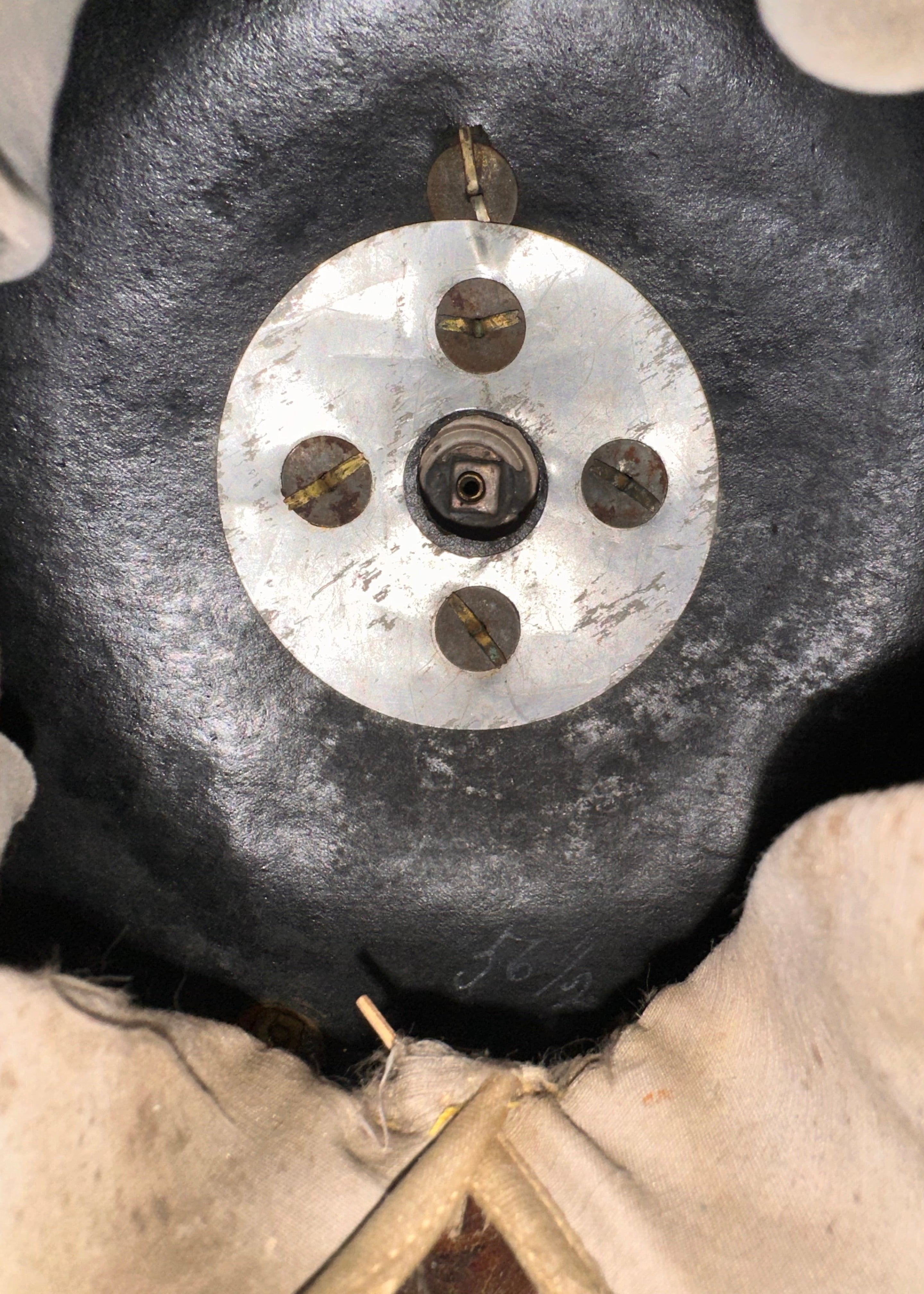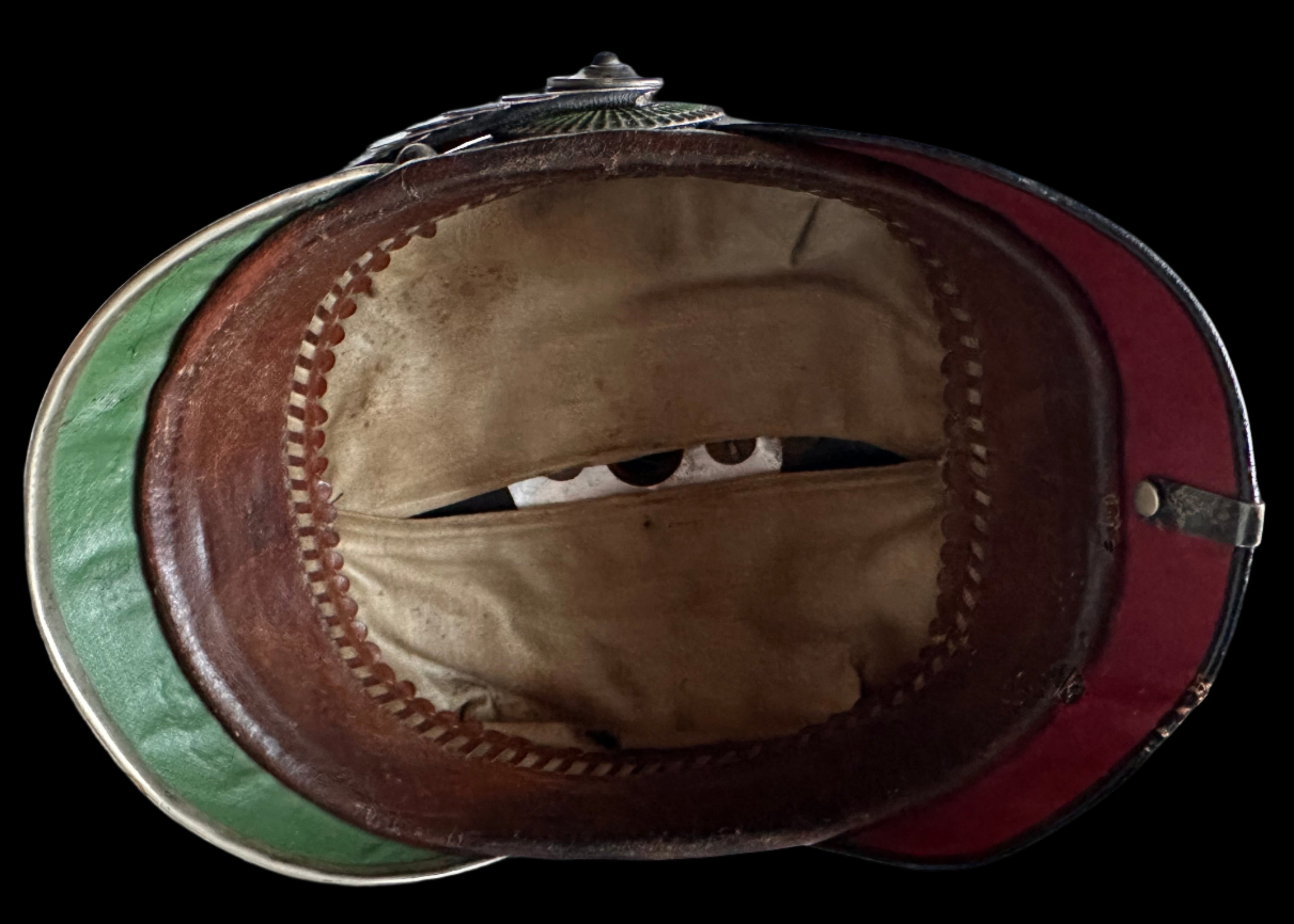 Inside, the helmet features a cross-stitched leather sweatband, fully intact and supple. The silk liner is the smooth variant, rendered in an unusual olive green color—a tone virtually never encountered on Saxon headgear. The silk remains clean and complete, showing only mild wear.