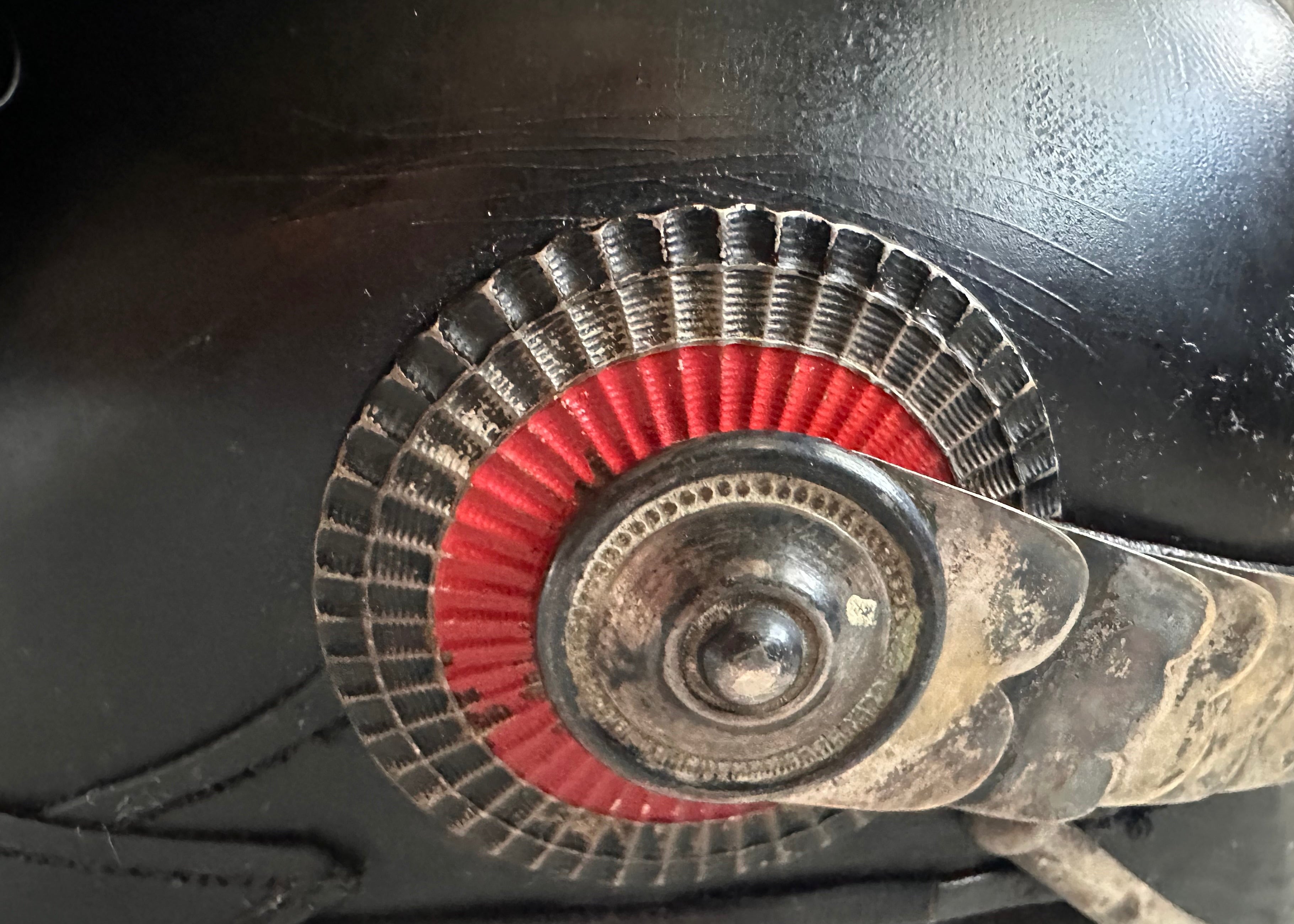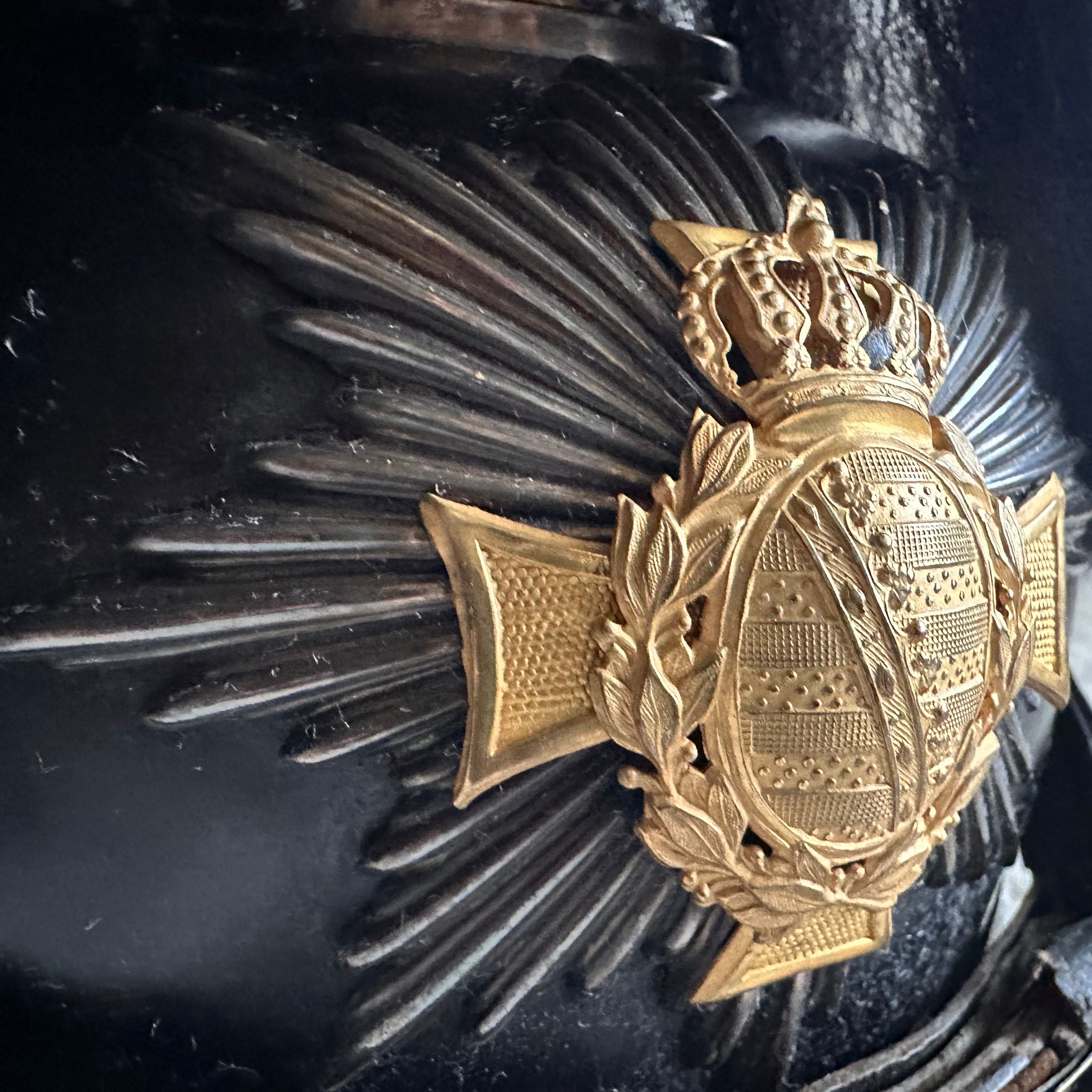 The existence of a dedicated officer Pickelhaube with trichter and parade bush for this single unit is highly unusual. Most pioneer formations did not carry spiked helmets with full ceremonial features, making this one of the rarest known Saxon officer helmets. The reserve officer cross beneath the Wappen further narrows its attribution and affirms its use in ceremonial and court functions rather than frontline service.