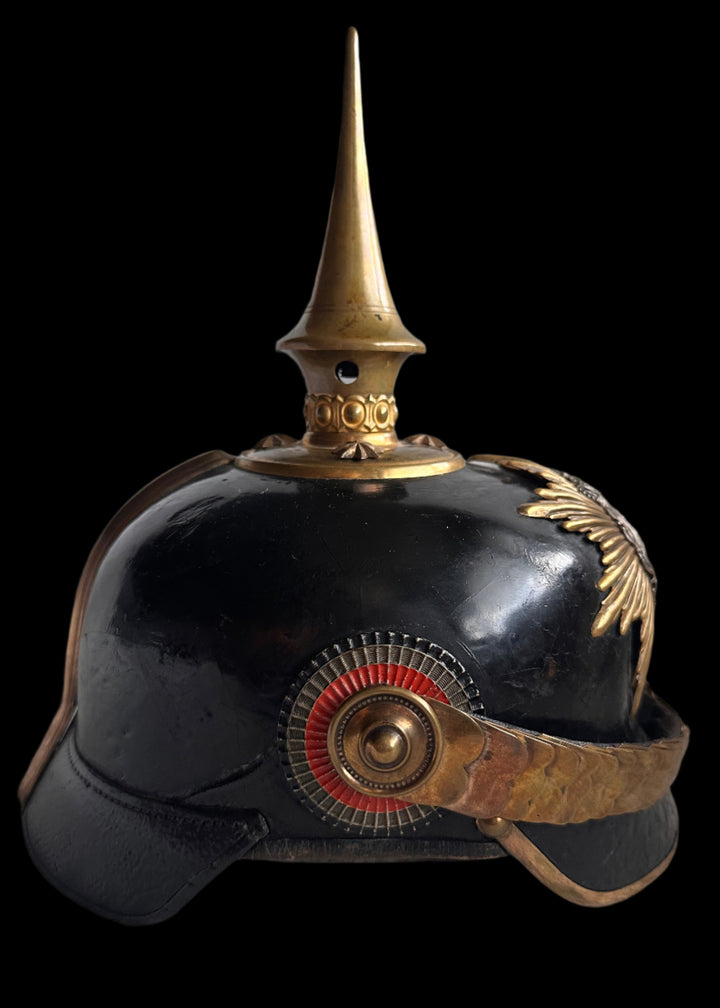 The presence of both cockades confirms this helmet was worn after the 1897 imperial edict requiring the addition of the national (Reich) cockade on all enlisted and officer helmets.