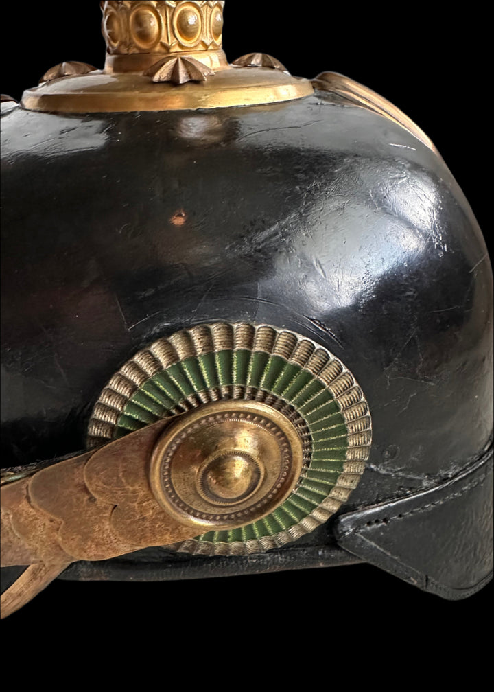 This Saxon line infantry officer’s Pickelhaube represents the height of regional distinction within the Imperial German Army. The striking two-tone Wappen — a gilded starburst overlaid with the silver Saxon royal arms — sets this helmet apart as a rare surviving officer configuration from one of the empire’s most independently styled kingdoms. It embodies both Saxony’s ornate tradition and the private-purchase refinement expected among officer ranks.