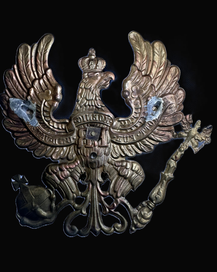 The eagle bears the traditional scroll motto "Mit Gott für König und Vaterland” (“With God for King and Fatherland”), and includes the characteristic orb and scepter clutched in the talons—standard for officer-grade insignia. The plate retains its original two-tone gilt and silver finish, now softened with patina consistent with age. The reverse shows intact mounting hardware and solder points, with no major bends or repairs, though minor wear is evident on the upper crown points and wing edges.