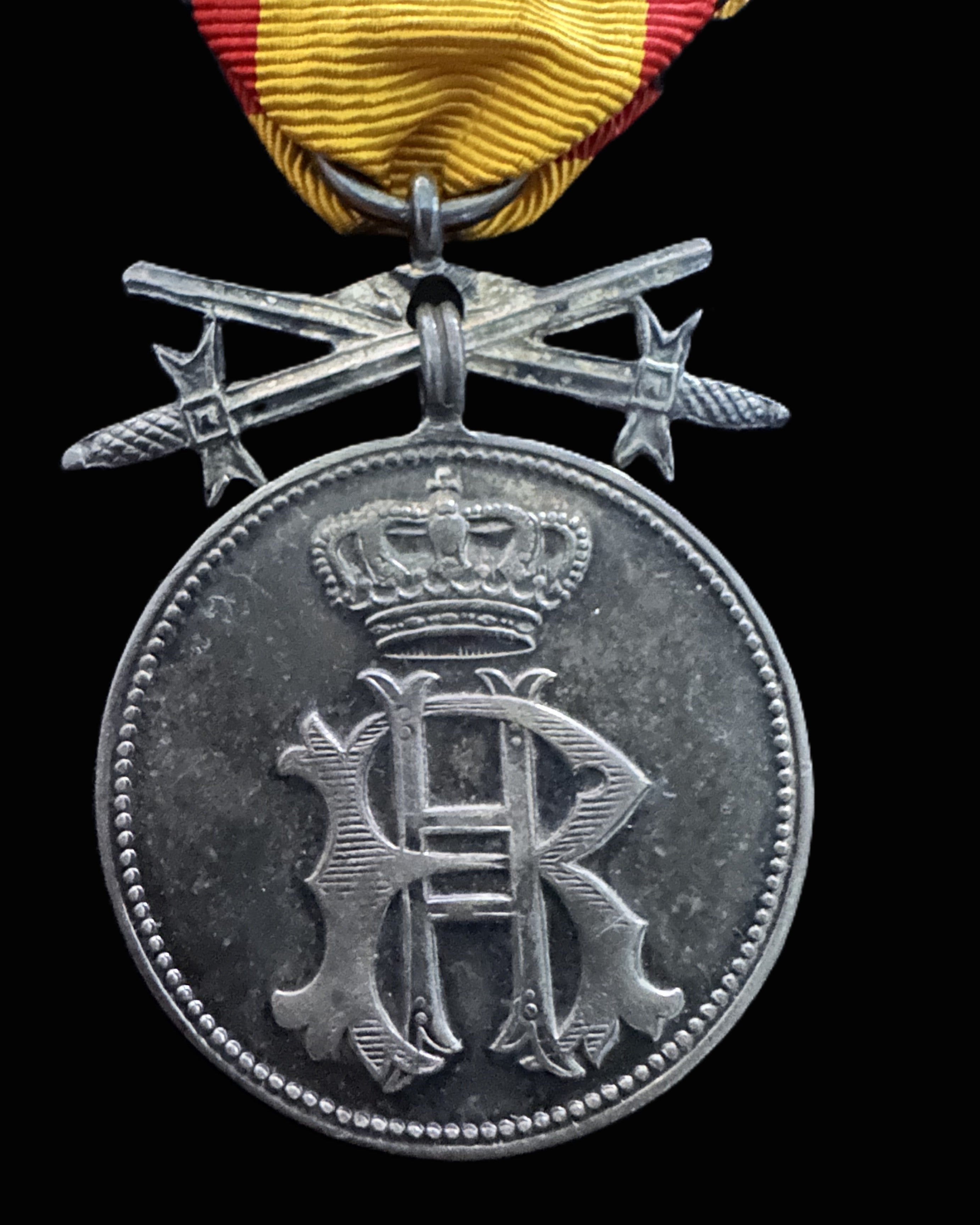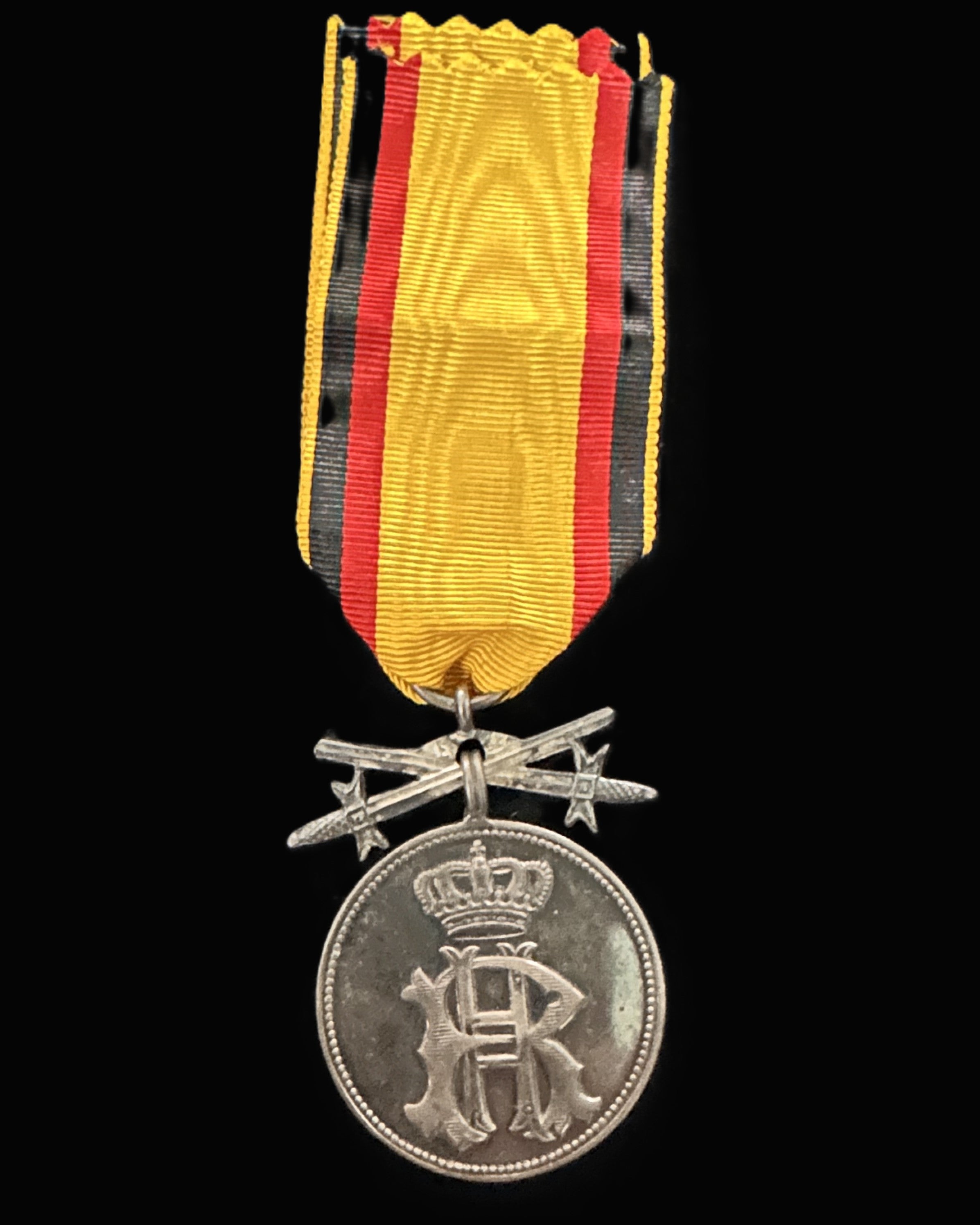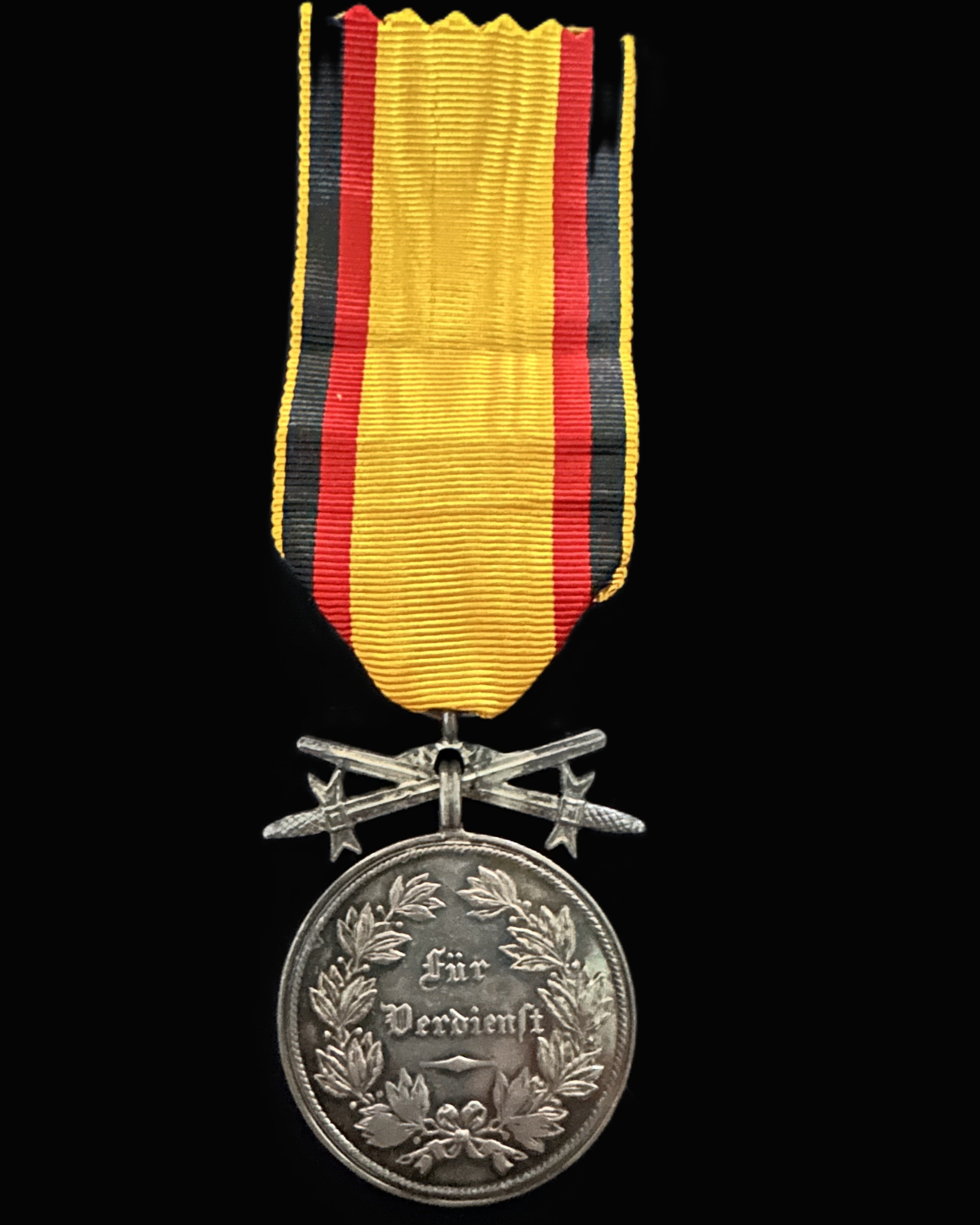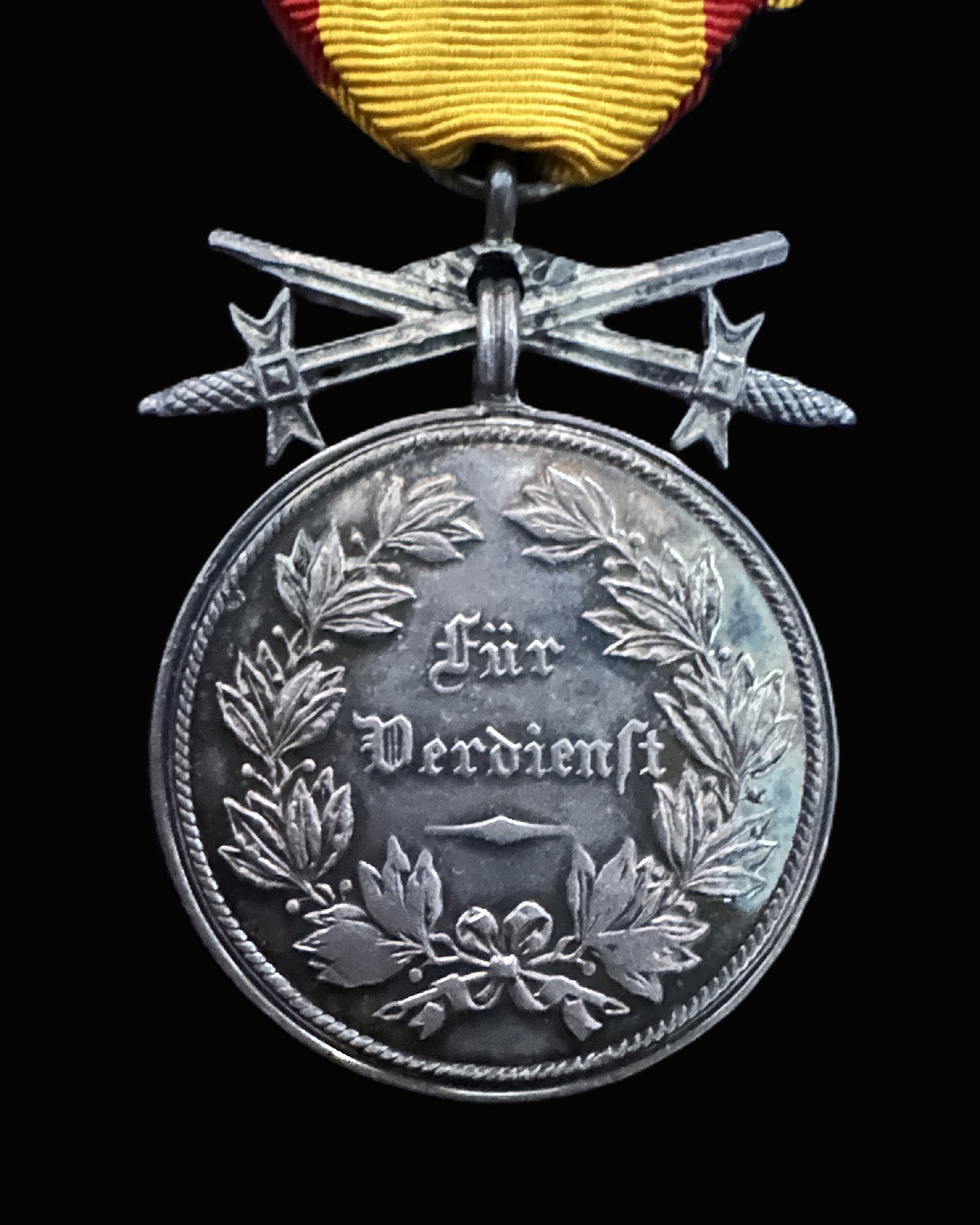The obverse displays the crowned royal monogram “FA” for Friedrich August within a beaded border. The reverse bears the inscription Für Verdienst (“For Merit”) within a finely detailed laurel wreath, symbolizing honor and achievement. The medal retains its original yellow, red, and black Saxon ribbon, mounted with the correct crossed-swords suspension for military merit awards.