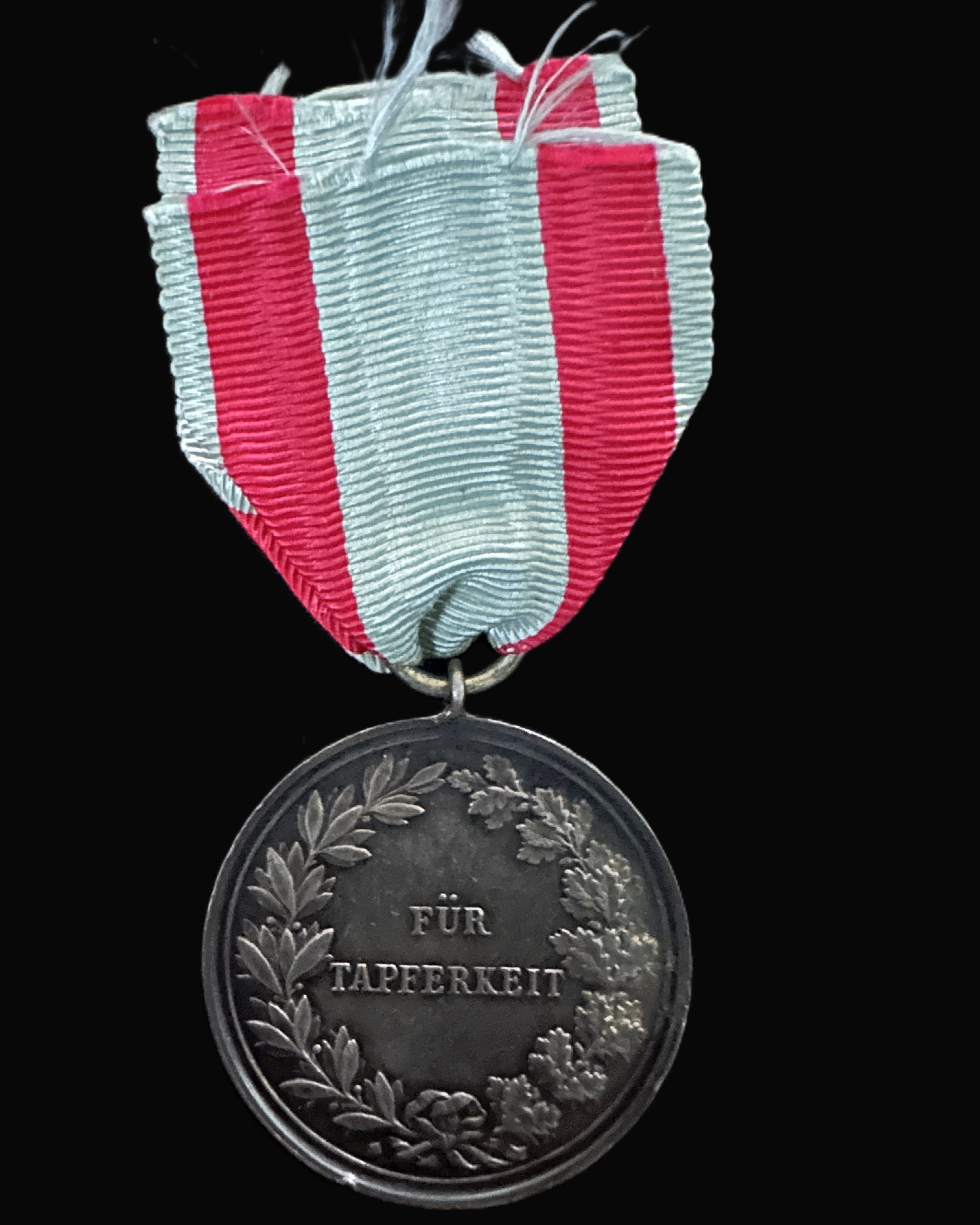 The reverse bears the inscription “FÜR TAPFERKEIT” (For Bravery), set within a wreath composed of laurel and oak leaves tied with a bow at the base. The wreath symbolism is significant, combining laurel for victory and oak for strength and endurance—an iconographic pairing long associated with German military virtue. The reverse fields show light contact marks and surface wear, again consistent with period wear, but the inscription remains sharp and fully legible. The medal retains its original suspension loop and ring, which show no signs of later replacement.