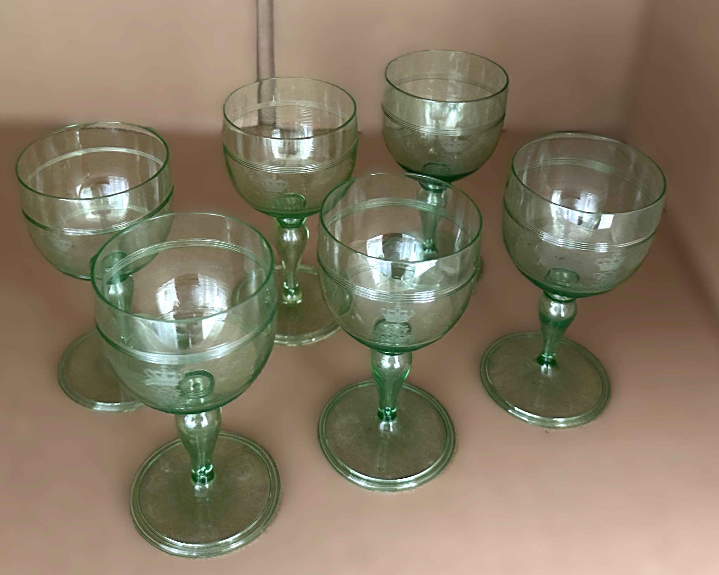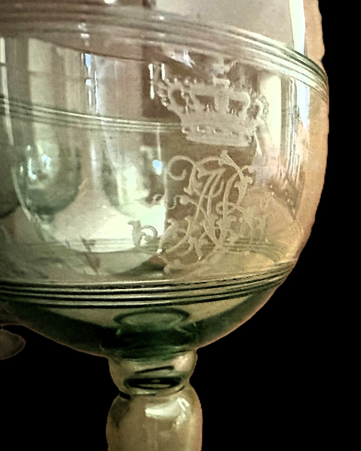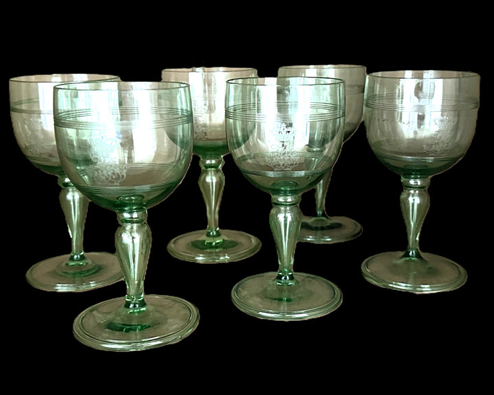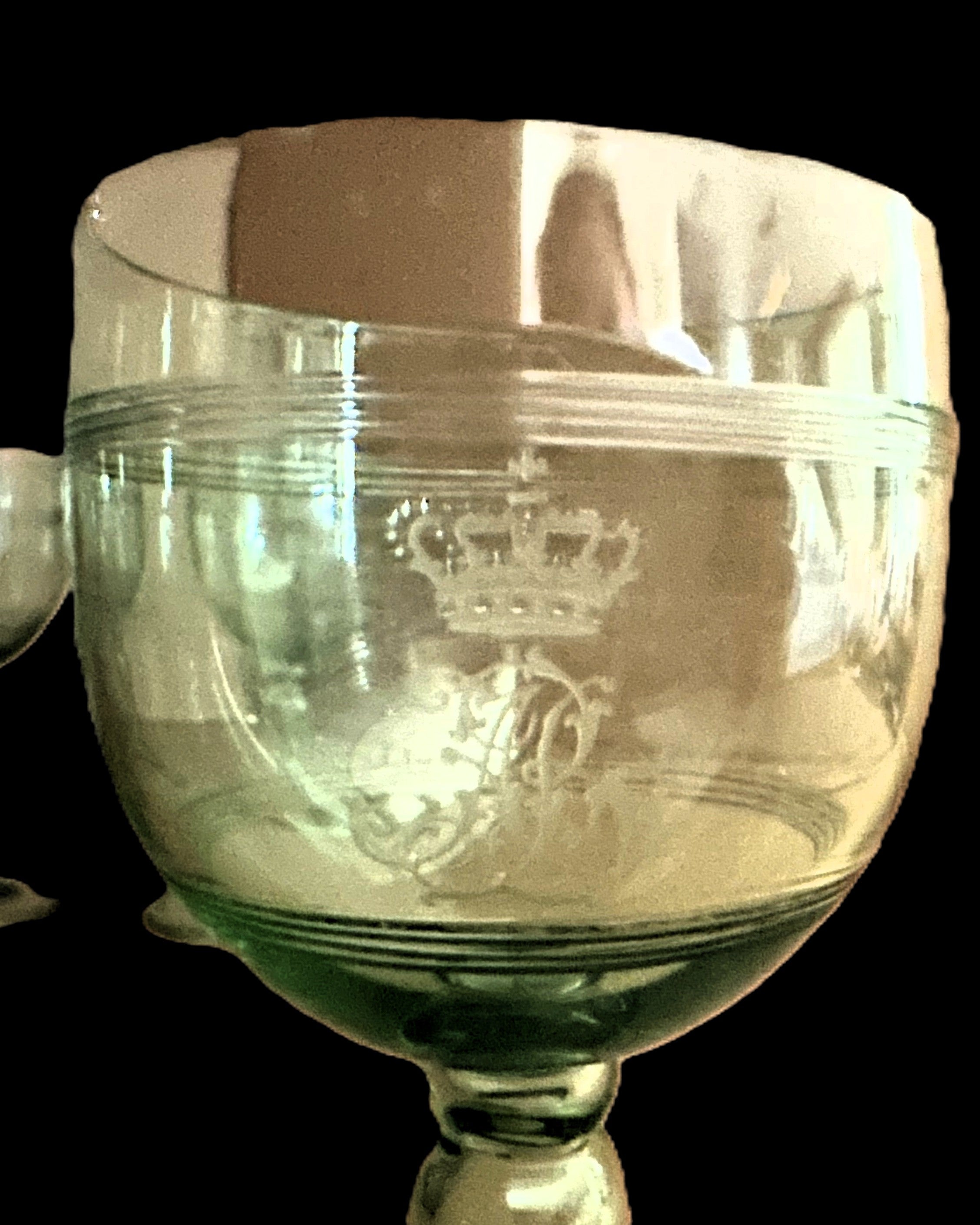 These glasses are of thick green-tinted glass with elegant knopped stems and wide rounded bowls. Each one features three finely cut horizontal bands above the monogram and one band beneath it, adding symmetry and highlighting the central etched insignia.