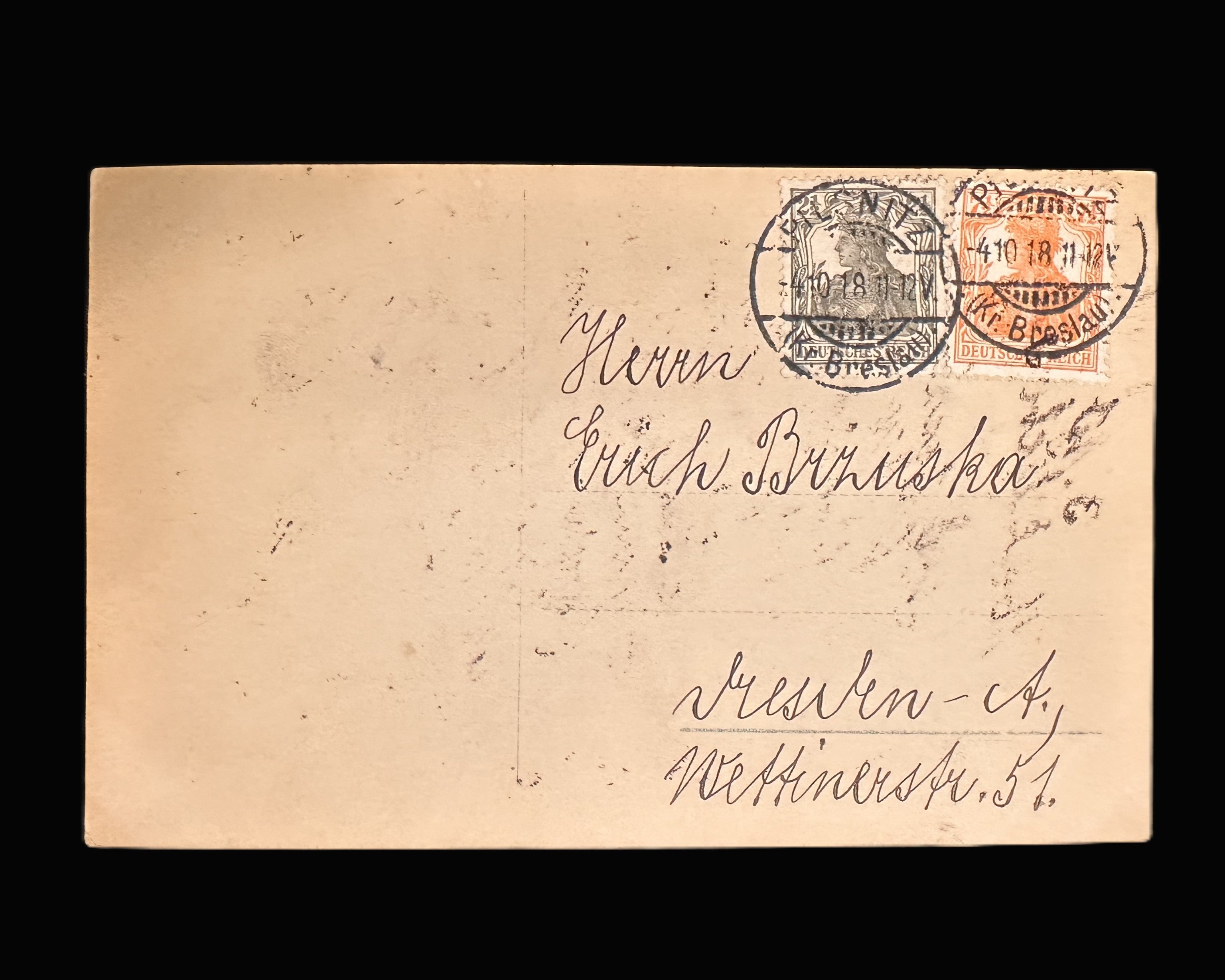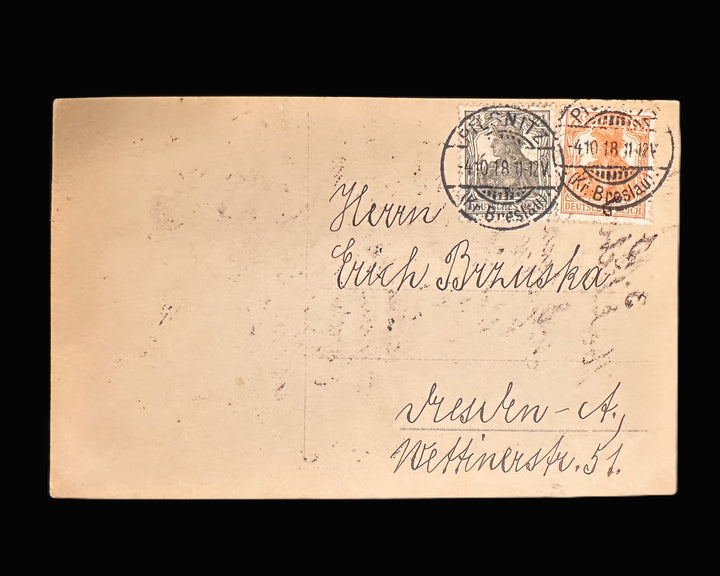 The reverse of the postcard shows clear evidence of genuine wartime use. It is franked with period German Empire stamps and bears a legible Breslau postmark dated 4 October 1918, one day after the dated inscription on the image side. The card is addressed to a civilian recipient in Breslau-A., providing direct postal and geographic context. This confirms the piece was not merely retained as an autograph collectible but functioned as actual wartime correspondence, adding a strong human and documentary dimension to the item.