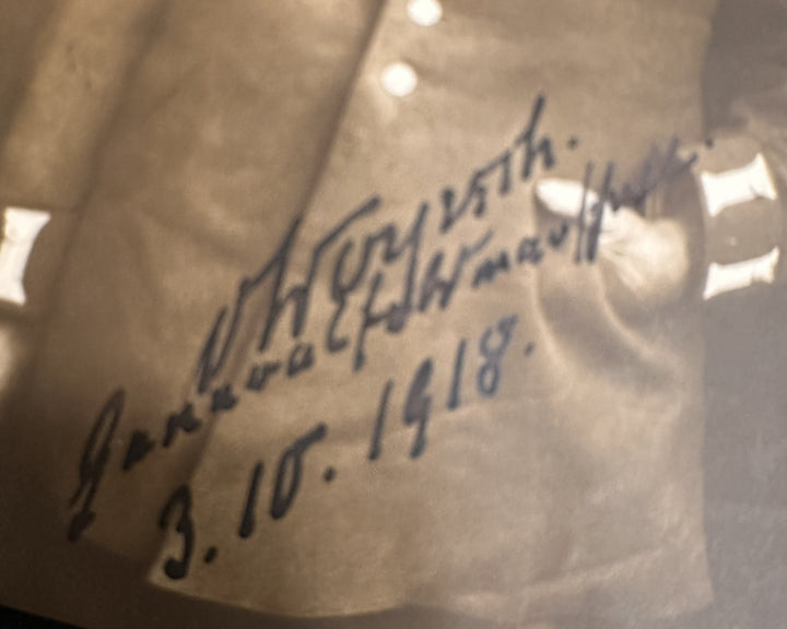 The lower right of the image bears a bold, flowing handwritten inscription and signature, executed directly onto the photographic surface and dated “3.10.1918.” The hand is confident and consistent with period examples of senior officer autographs, strongly indicating an original contemporary signature rather than a printed facsimile. The timing of the inscription is especially significant, as it places the signing of this card during the final weeks of the First World War, only weeks before the Armistice, when the German Army and Imperial system were on the verge of collapse.