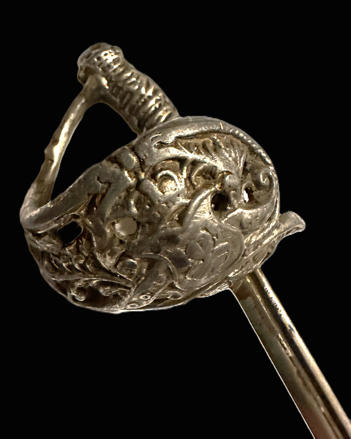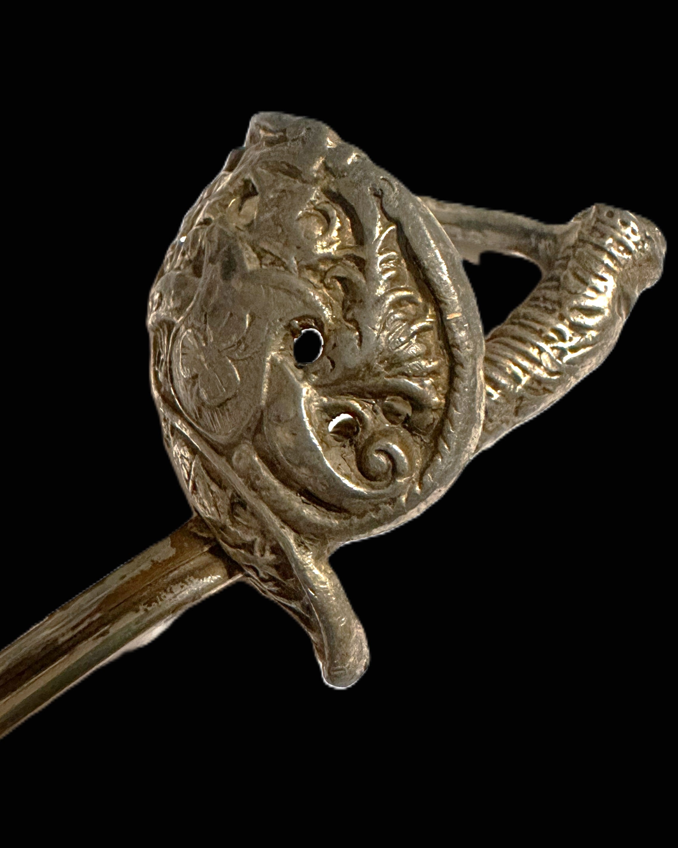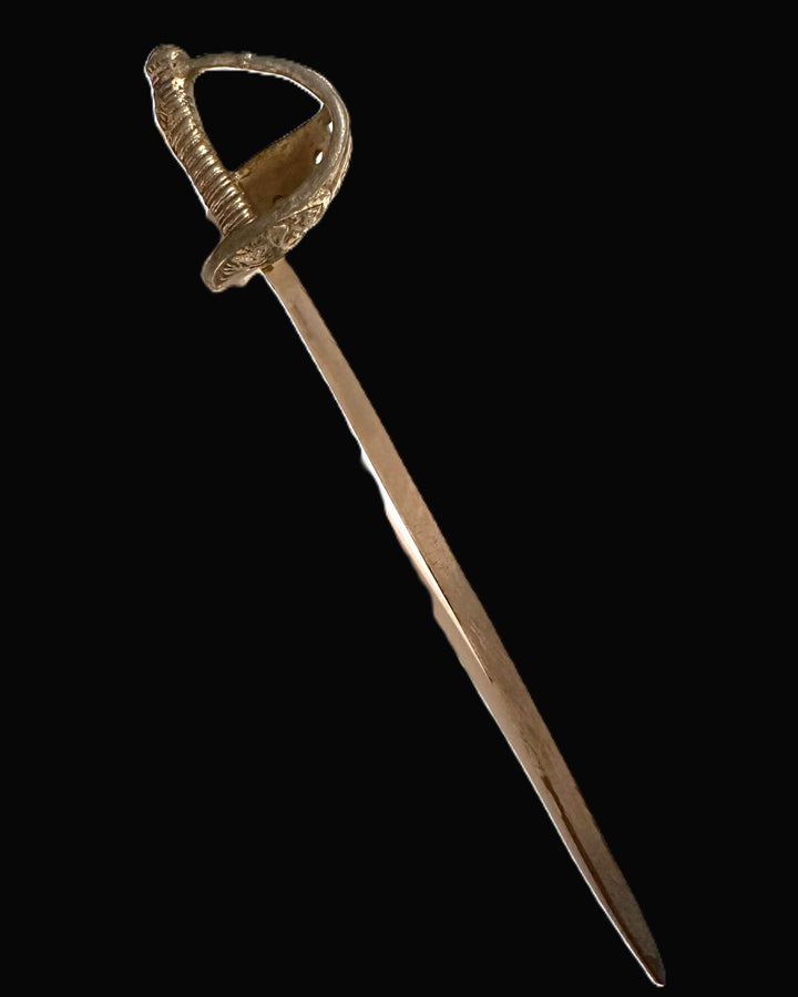 Collectors value these miniatures for their connection to officer culture, for their sometimes-idiosyncratic craftsmanship, and for their decorative appeal when displayed with period desk items or alongside full-sized edged weapons. The present example shows honest wear and finish loss along the guard’s edges and blade flats, small casting pits inside the basket, and slight waviness along the blade—normal for a cast piece of its type. There is no scabbard, as expected for this class of objet de bureau.