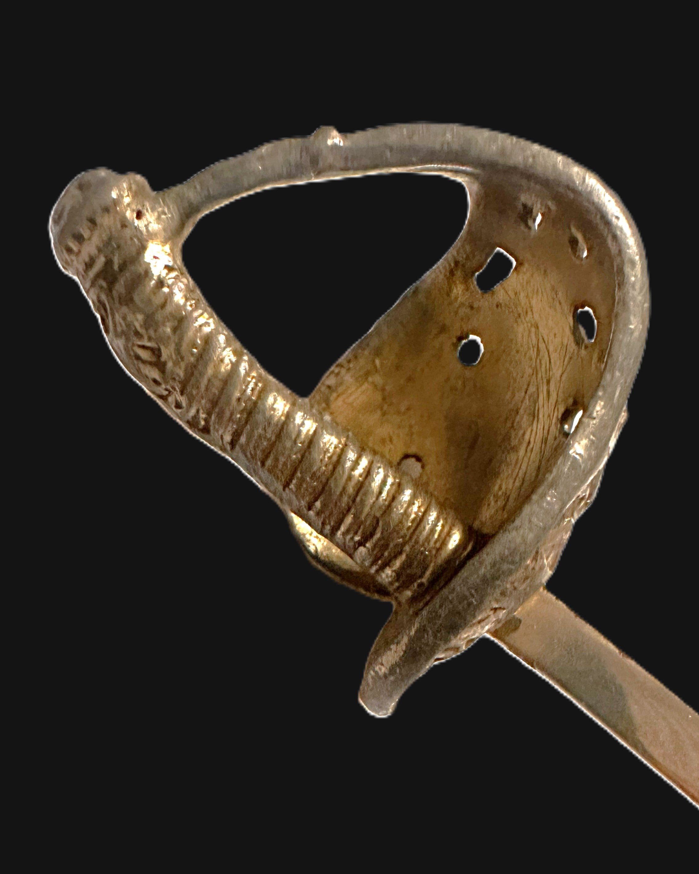 The form is not meant to replicate a single regulation pattern but rather to evoke the ornate basket-hilts carried by aristocratic cavalry officers across Central Europe. Such desk ornaments were popular presentation items during the Wilhelmine and Habsburg eras, offered as commemorative gifts, regimental souvenirs, or desk novelties for officers and staff personnel. The heavy use of scrollwork and the pierced guard draw directly from the decorative traditions of court and guard cavalry units, whose full-sized weapons frequently incorporated florid repoussé or pierced motifs. These miniature sabres performed a practical clerical function while also signaling affiliation with the martial culture of the cavalry—still a prestigious branch at the turn of the century.