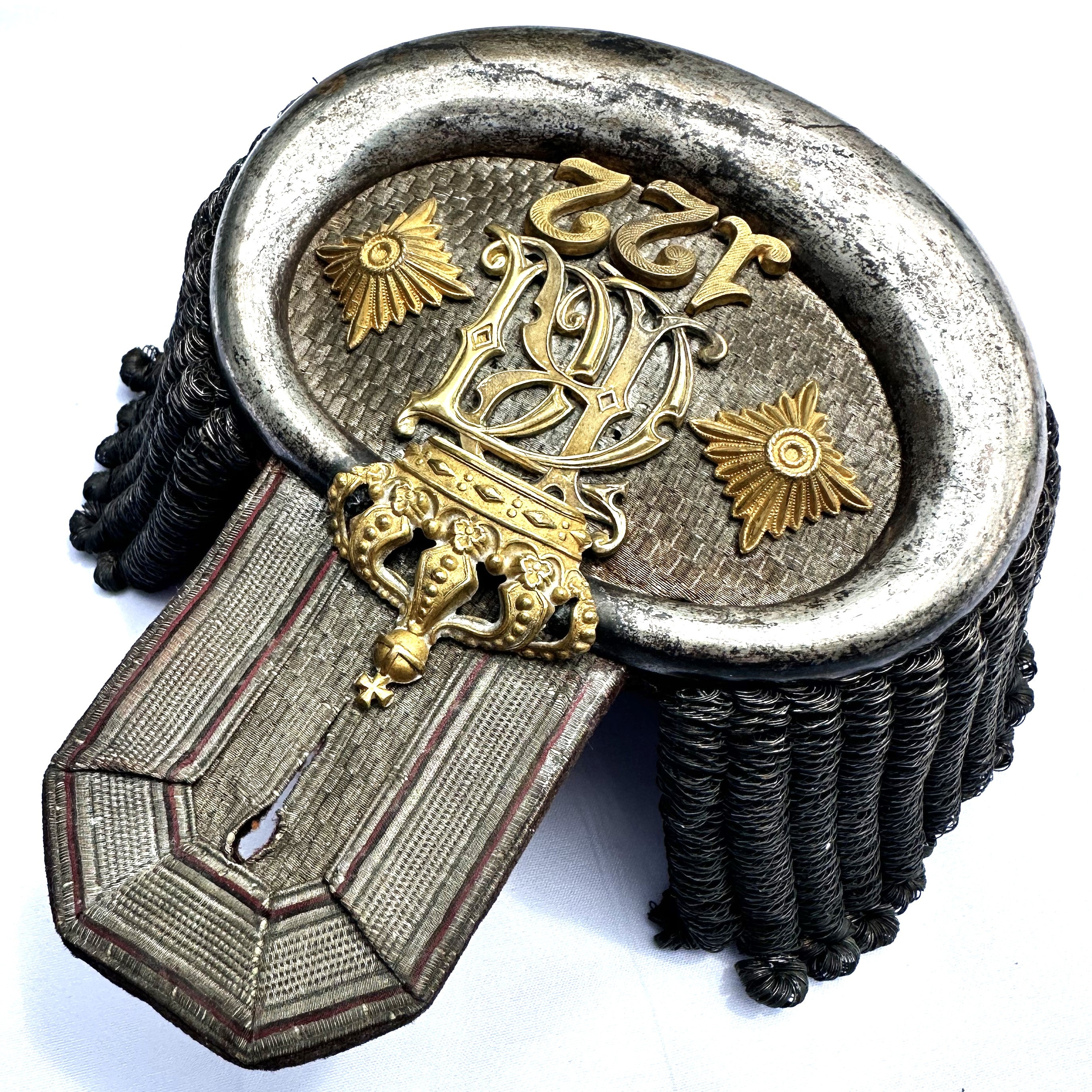 Own a piece of military history with this exquisite single epaulet from Infanterie-Regiment Nr 122, a unit with a storied legacy dating back to 1806. This epaulet was worn by a General der Infanterie, likely of noble or royal descent, serving as the Regimental Chef of Füsilier-Regiment Kaiser Franz Joseph von Österreich, König von Ungarn (4. Württembergisches) Nr 122, predominantly stationed at Heilbronn with a battalion at Mergentheim.