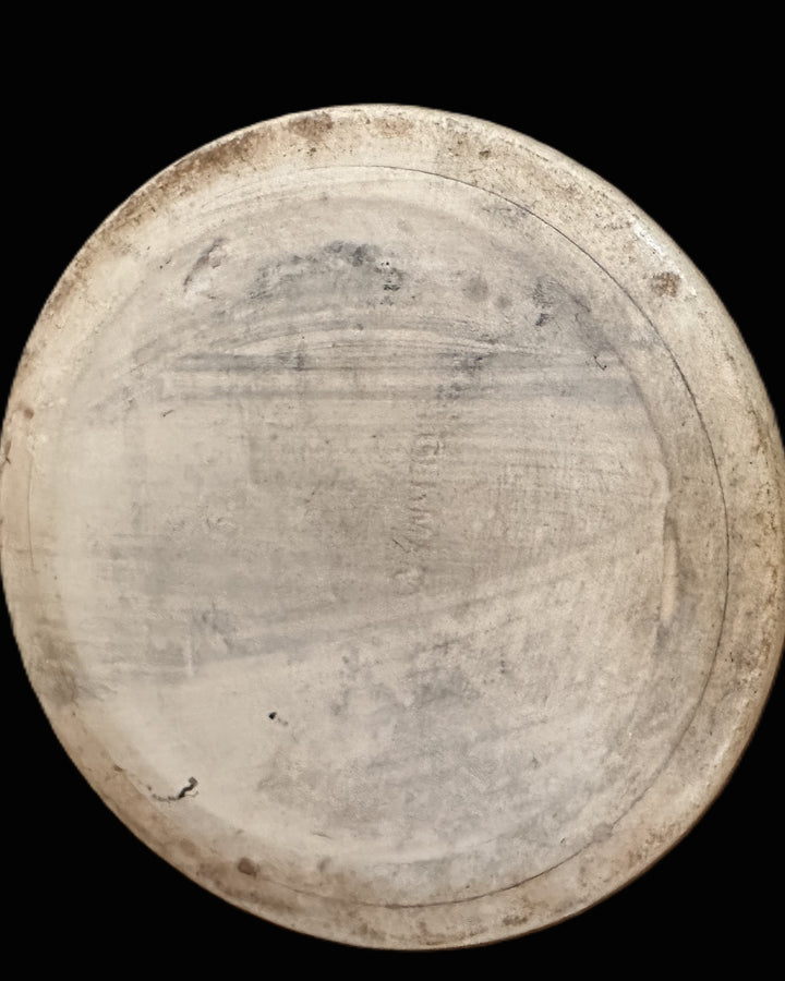 The underside is unglazed and shows the original turning marks, with a faint impressed mark partially readable — possibly indicating a regional Westerwald workshop, though the exact maker is not confirmed. The lip bears faint crazing in the glaze, consistent with natural aging and handling over more than a century.