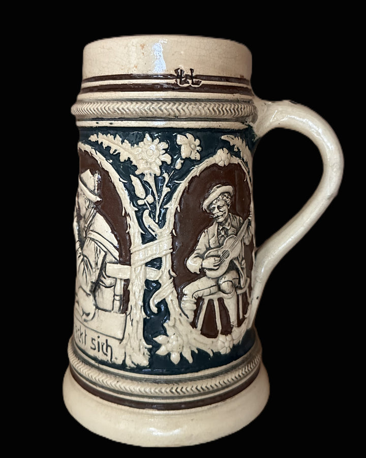 This is an original hand-molded German stoneware beer stein from the late 19th to early 20th century, featuring rich relief decoration and classic folk motifs from the Imperial German period. This stein is not a regimental example, but rather a civilian tavern-style piece that captures the humor and romance of everyday German life.