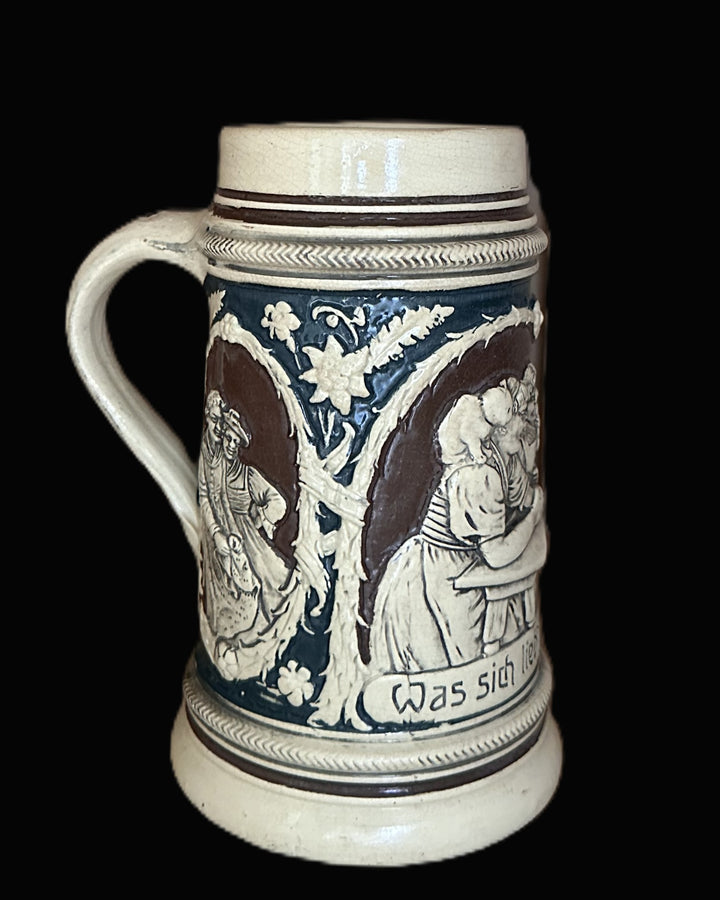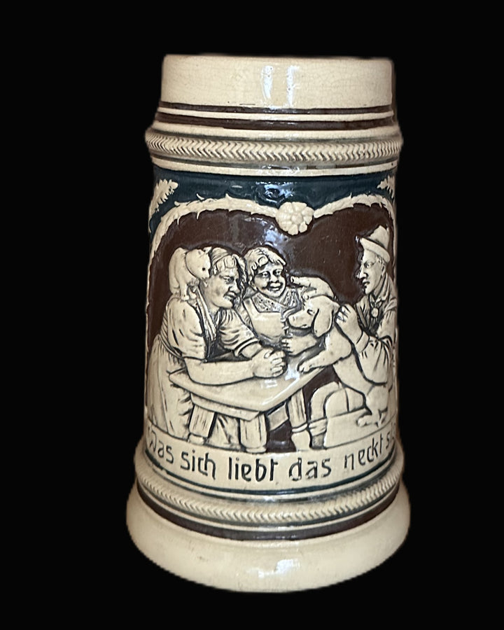 Stoneware beer stein – “Was sich liebt das neckt sich” tavern scene – circa 1890–1910