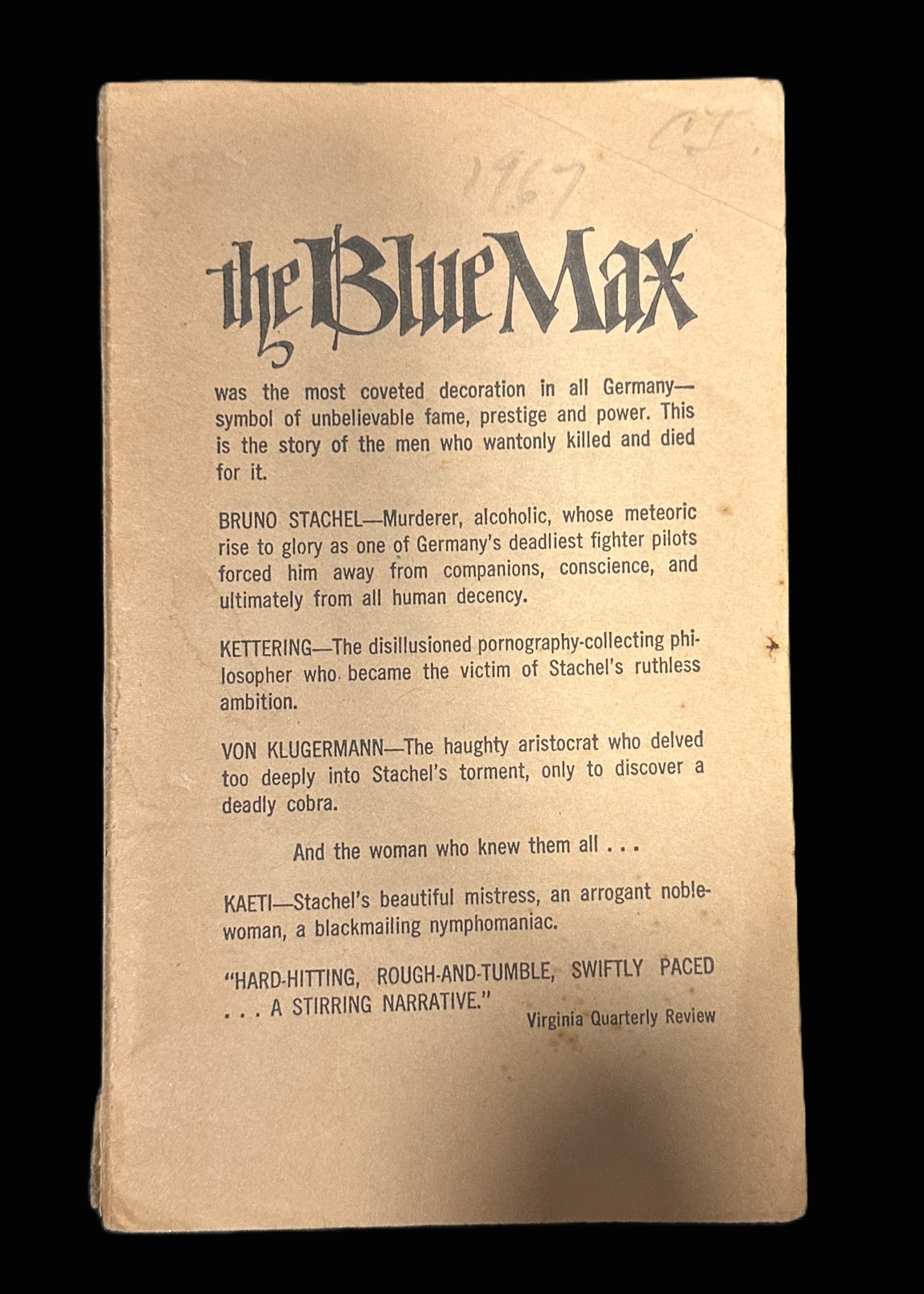 This is an extraordinary association copy of The Blue Max, personally inscribed and signed by author Jack D. Hunter to Ken Greenfield, founder of Der Rittmeister Militaria. The book is a Bantam paperback edition, with full text intact and a historic provenance linking one of the most important WWI aviation novels to a well-known figure in the militaria collecting world.